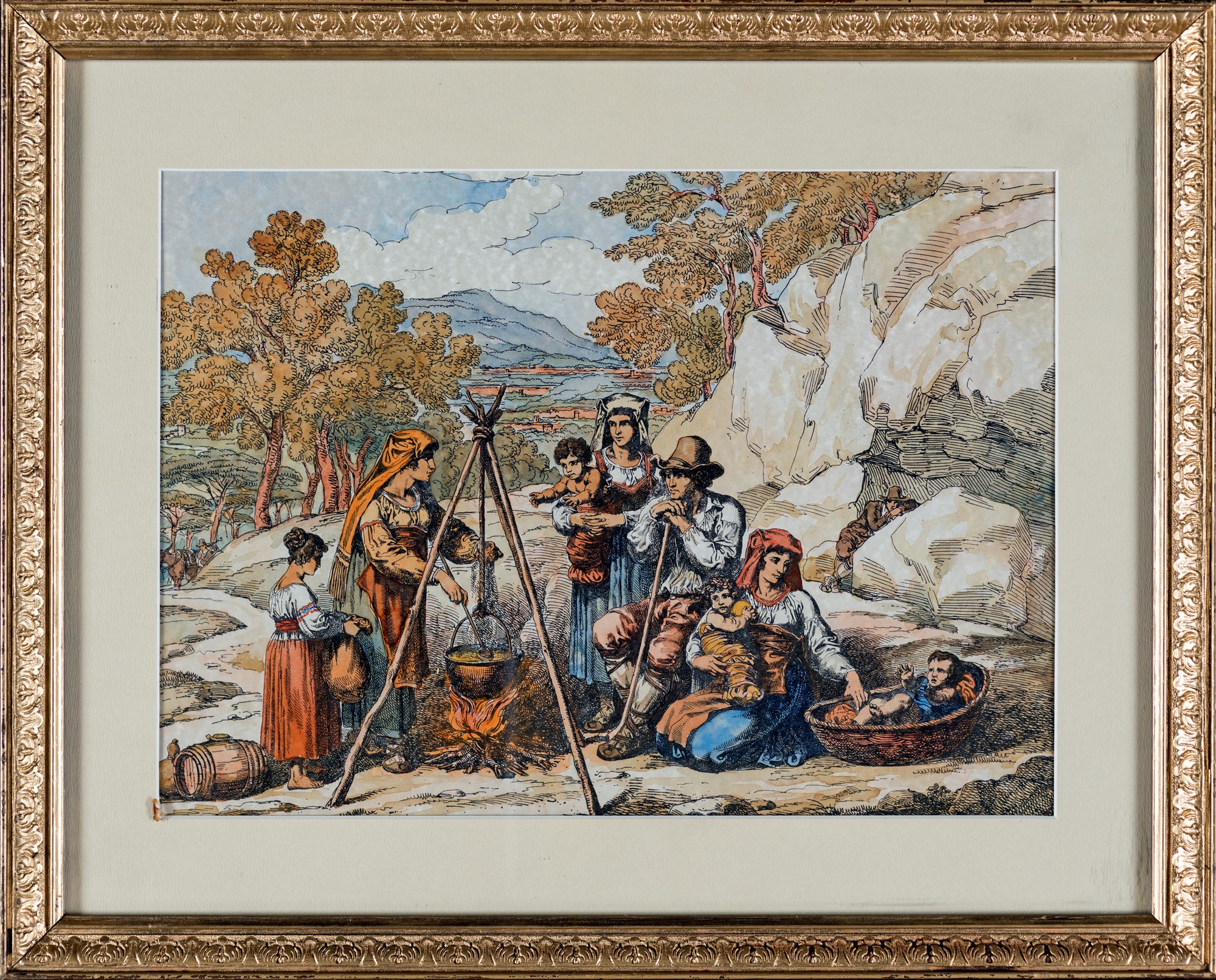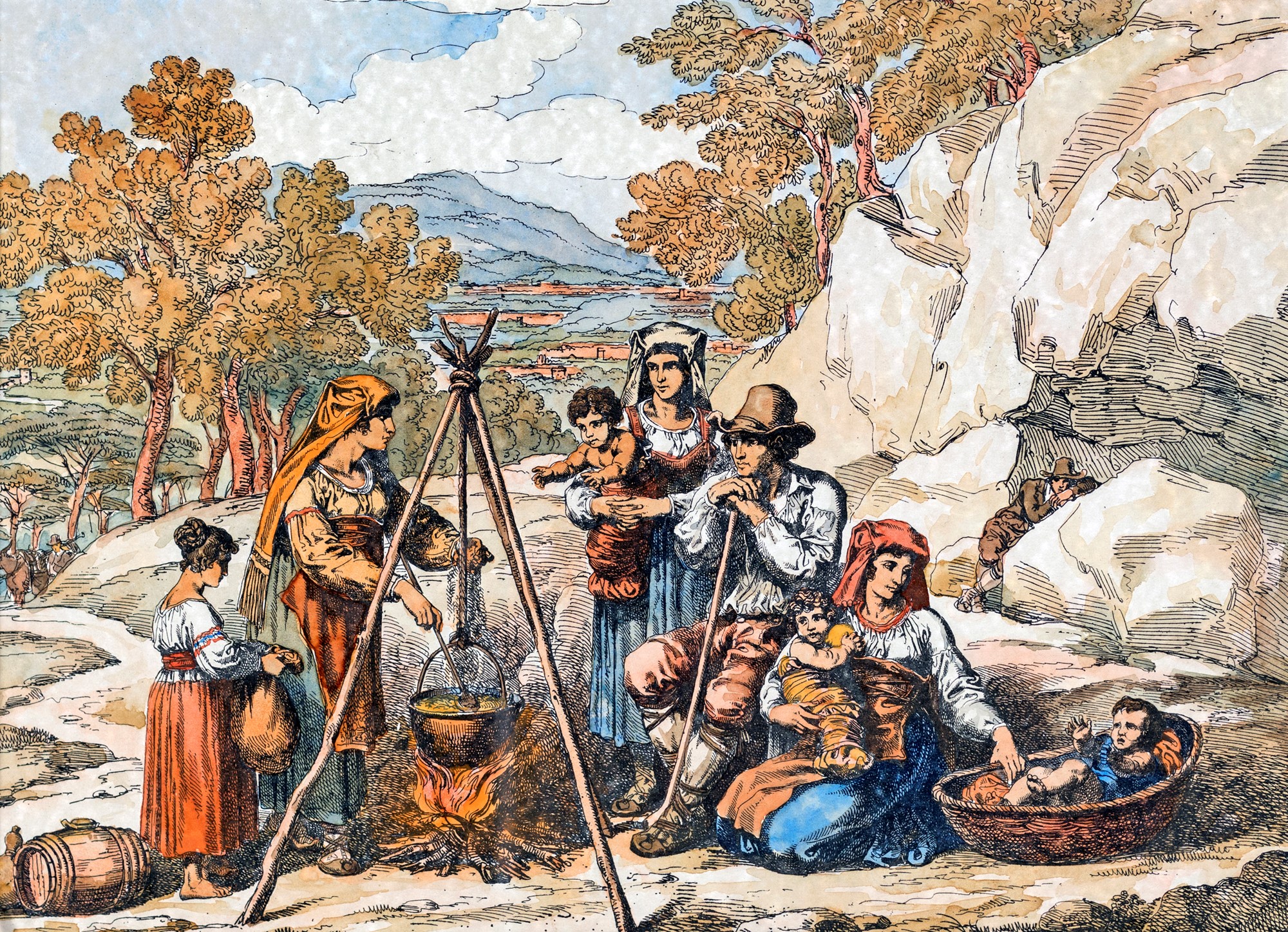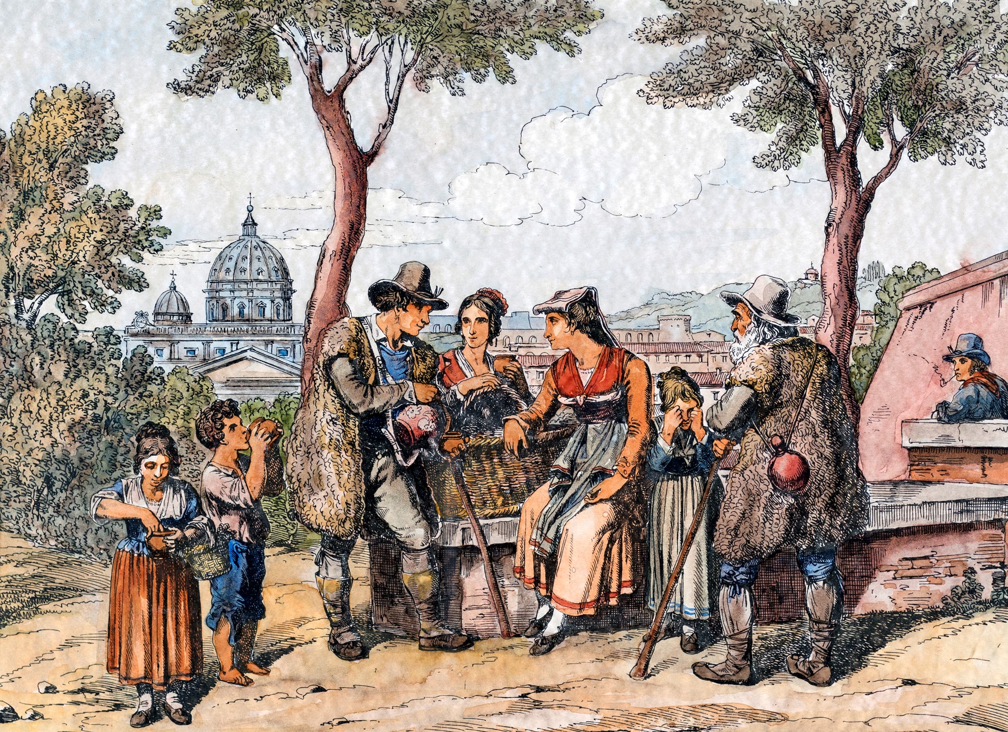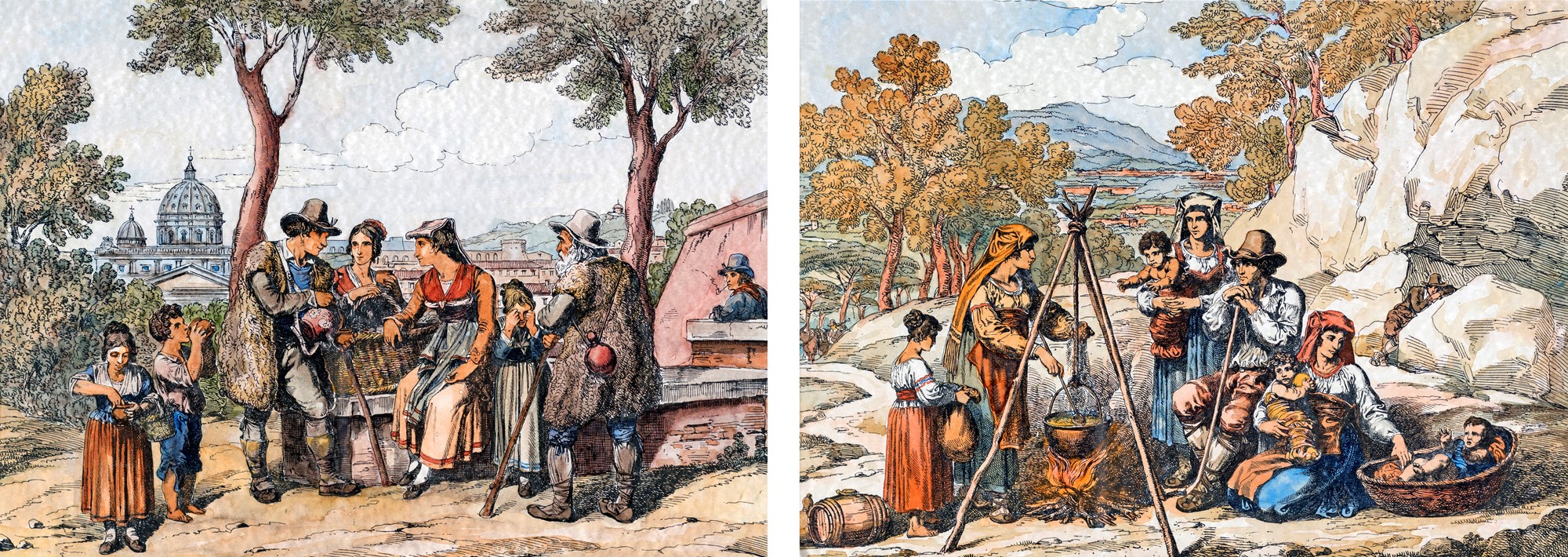 Scene di genere con figure in abiti popolari - coppia di delineati...