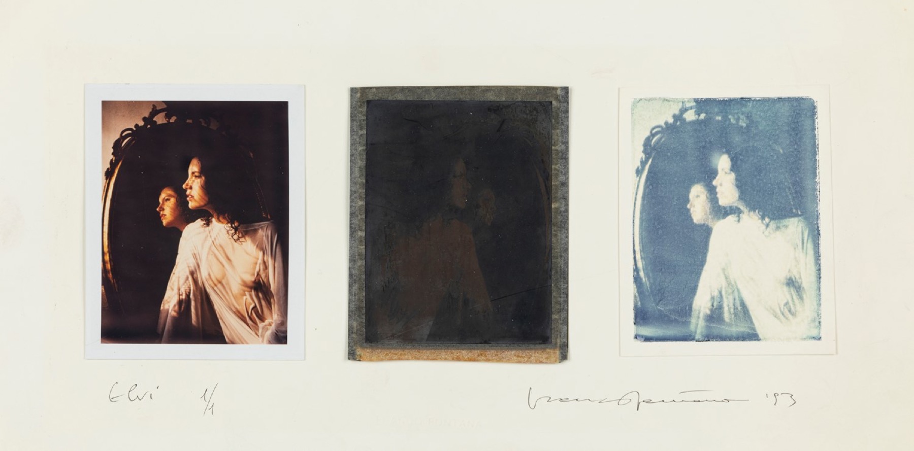 Trittico di polaroid (polaroid e polaroid trasferite) montate su cartoncino originale