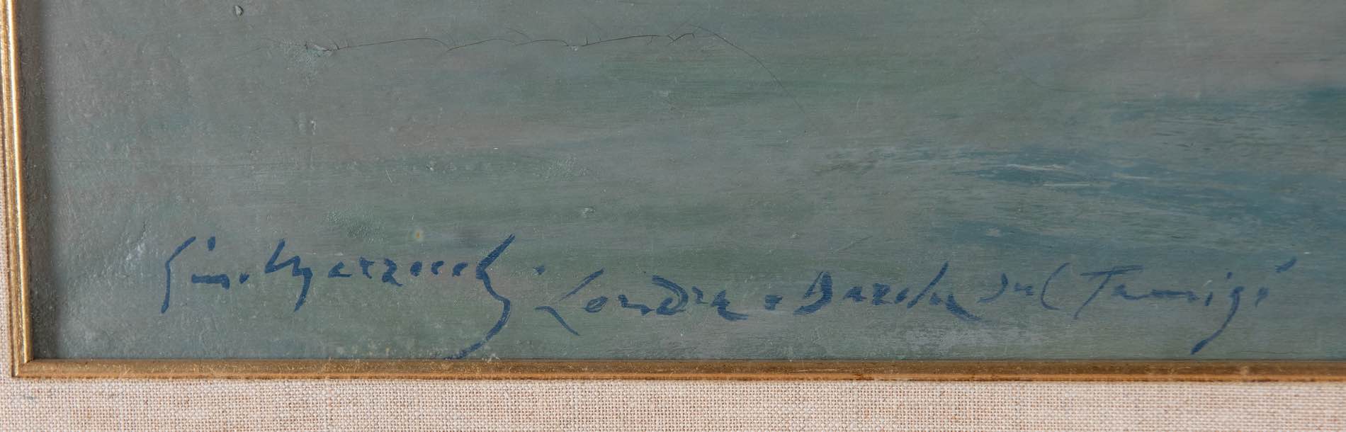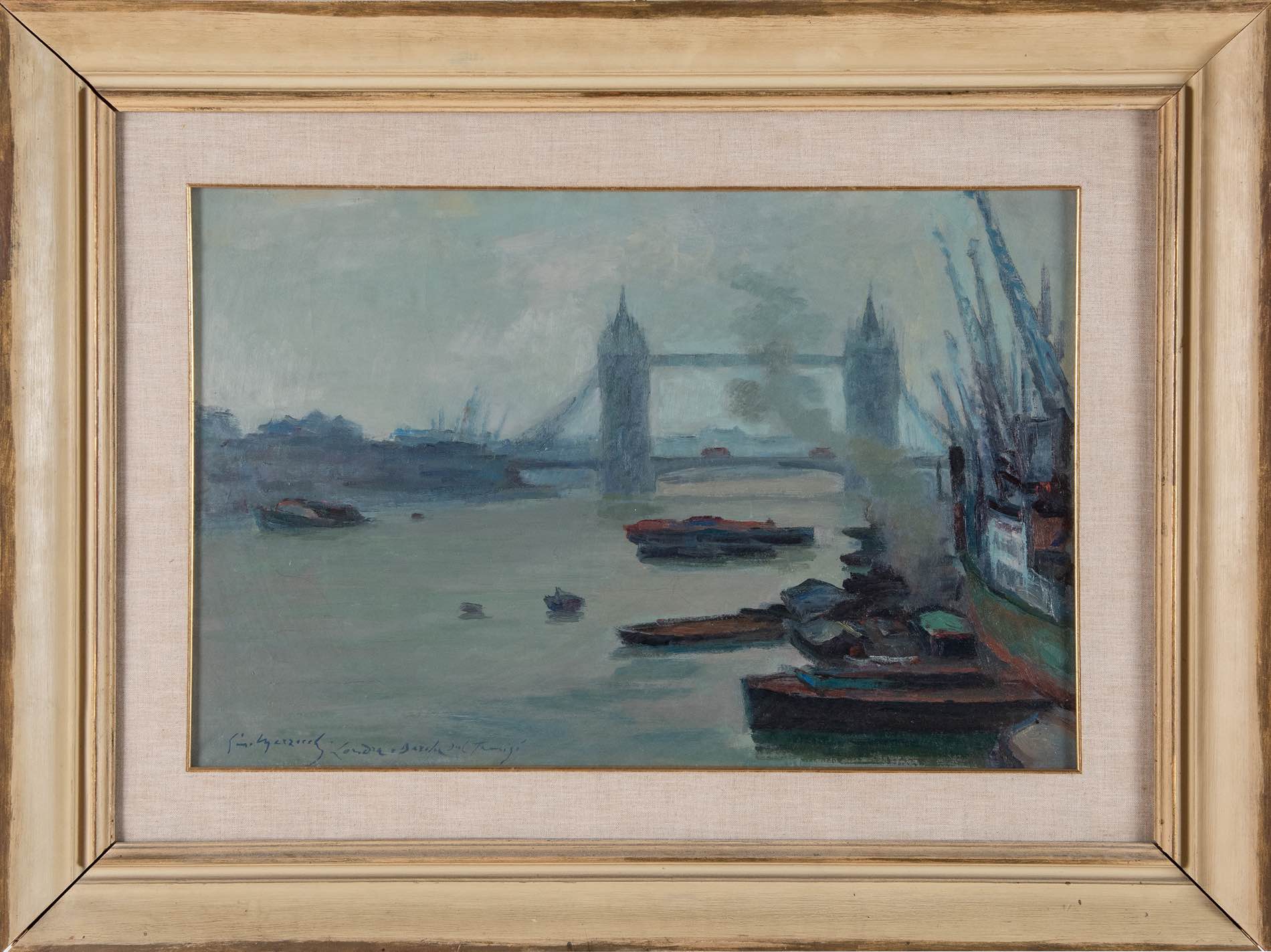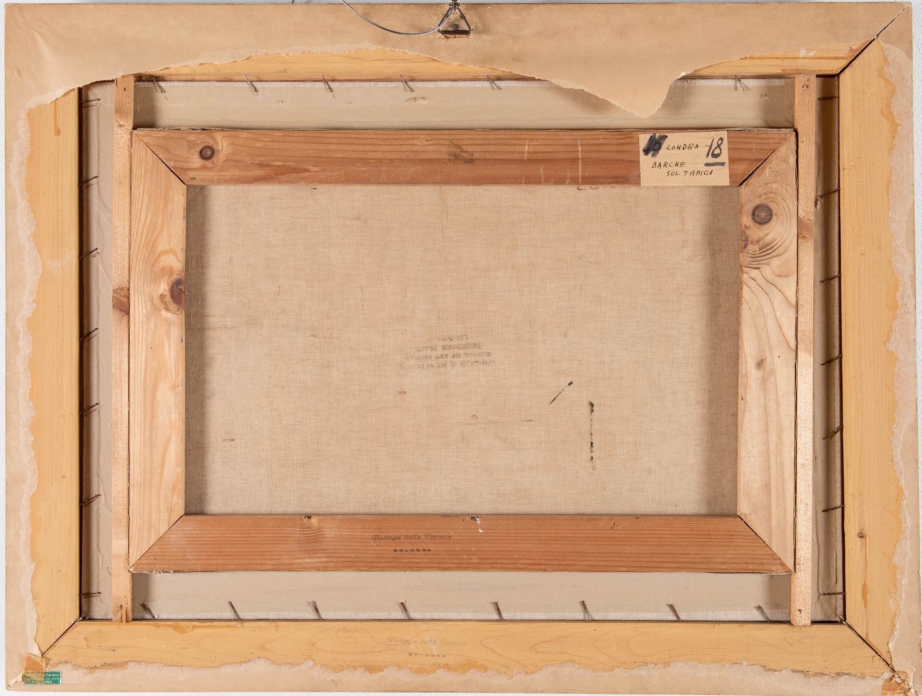 Gino Marzocchi (Molinella 1895 - Bologna 1981), “Barche sul Tamigi”, 1950. - Olio su tela, firmato e titolato in basso a sinistra Gino Marzocchi Londra - Barche sul Tamigi, H cm 40x60 Al retro reca timbro Winsor & Newton School of Art - Londra. Bibliografia di riferimento: opera pubblicata in ‘Dipinti di Gino Marzocchi’ - Tamari Editori in Bologna, 1970.