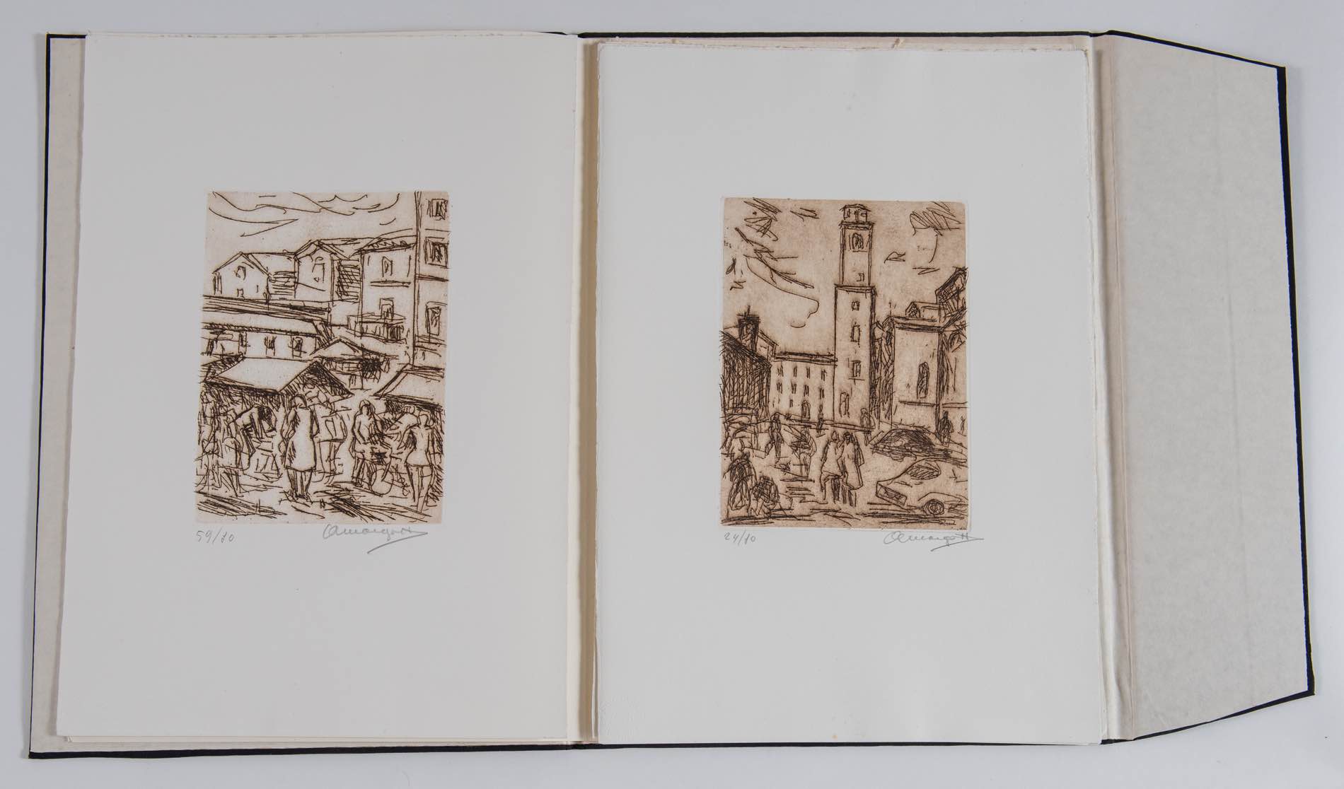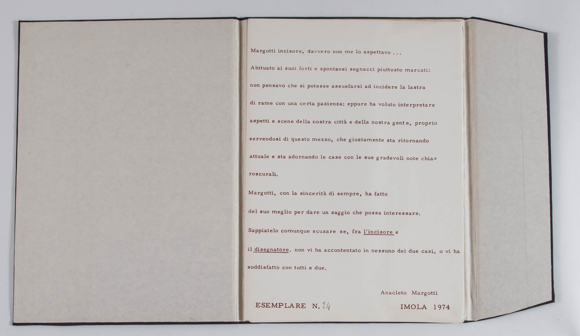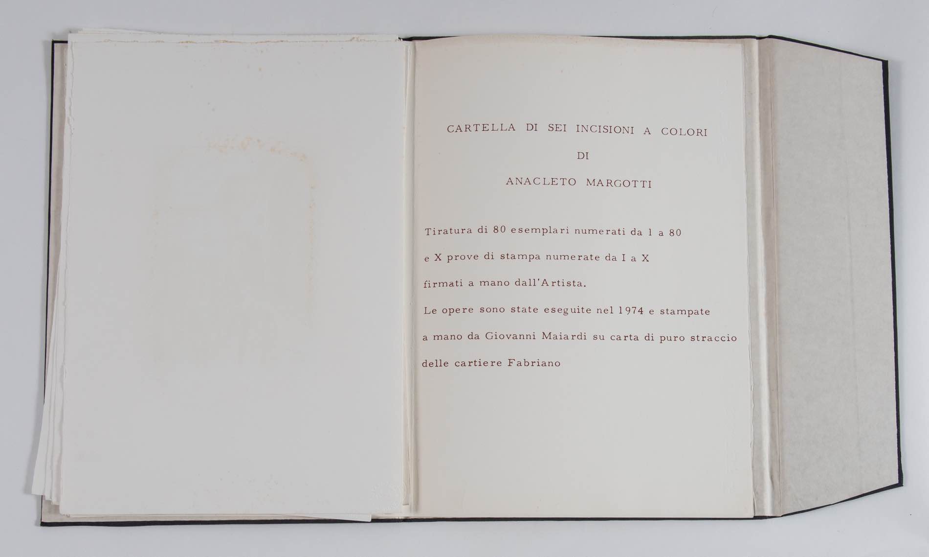 Anacleto Margotti (San Potito di Lugo 1896 - Imola 1984), “Senza titolo”, 1974. - Cartellina con 6 incisioni a colori numerate e firmate dall’artista, stampate in 80 esemplari formato H cm 35x50, timbro a secco Arte Grafica Ravenna, entro cartellina originale