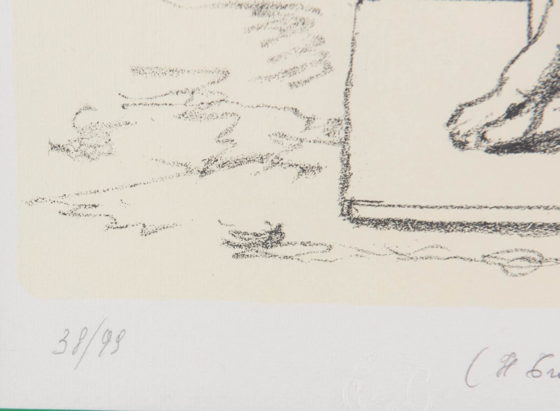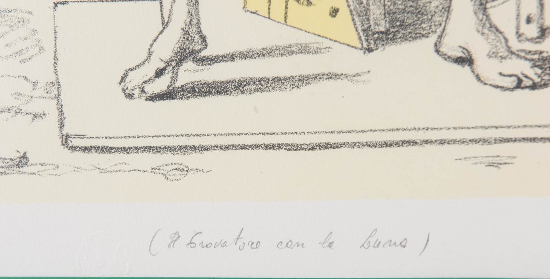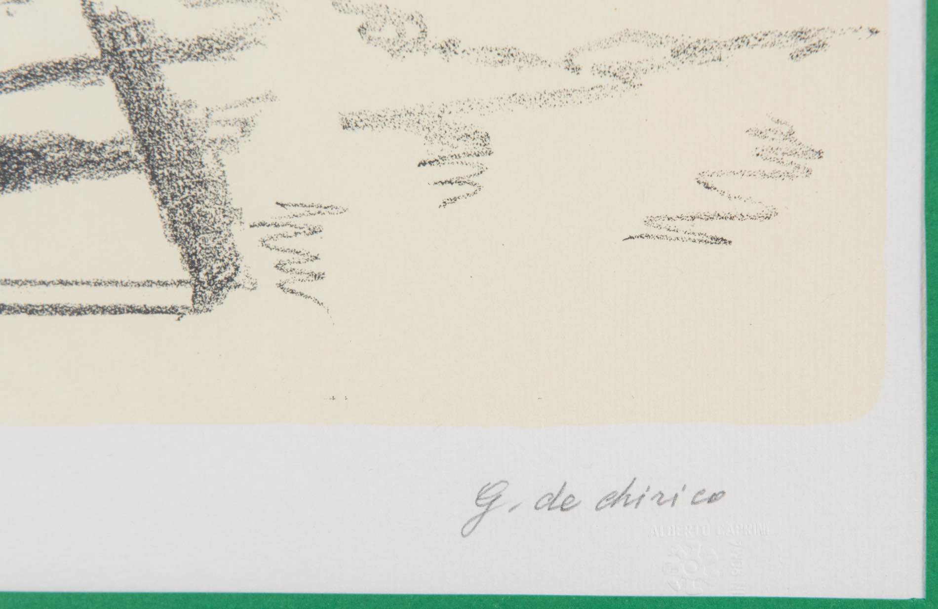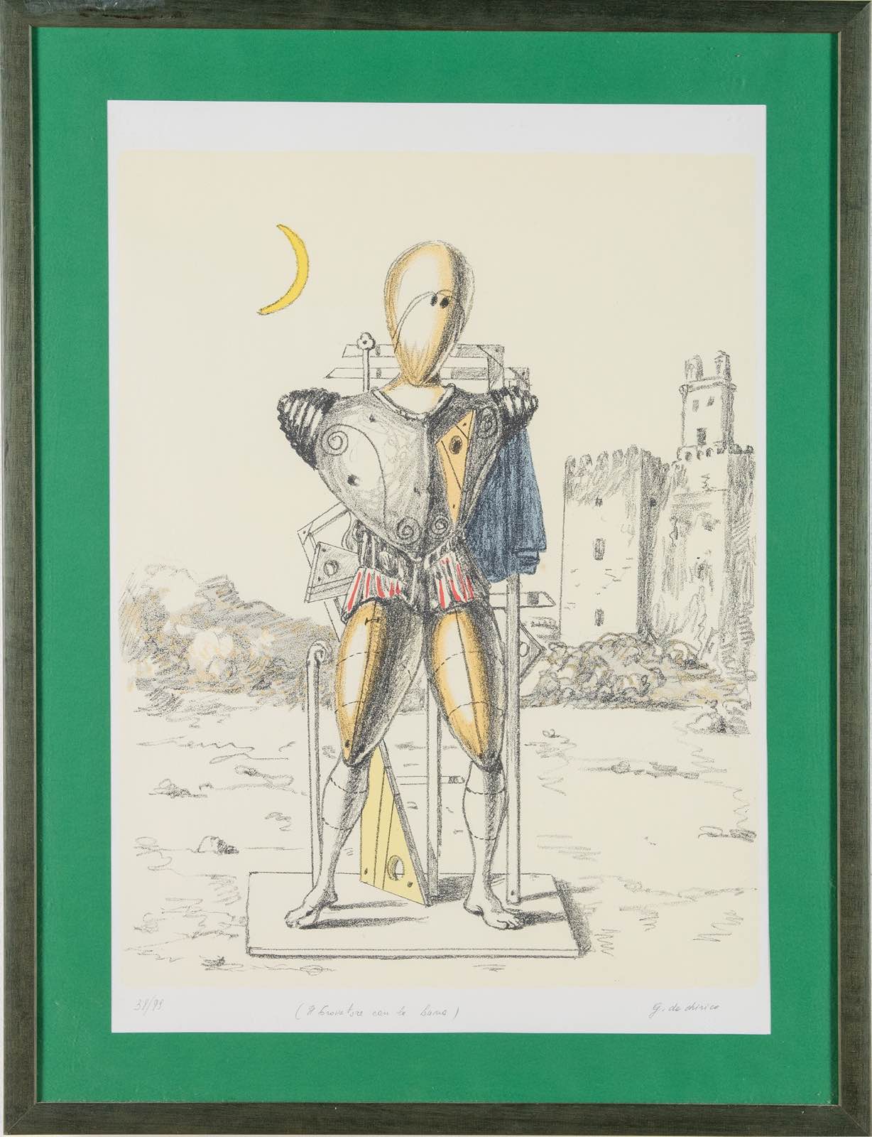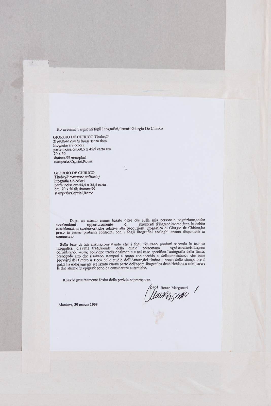 Giorgio de Chirico (Volo 1888 - Roma 1978), “Il Trovatore con la luna”. - Litografia a sette colori su carta, firmata in basso a destra G. de Chirico, numero di tiratura in basso a sinistra 38/99, timbri a secco GdC e Alberto Caprino Stampatore - Roma, Foglio H cm 70x50 - Lartra H cm 60.5x45.5 Opera accompagnata da certificato di autenticità a firma Renzo Margonari - 30 Marzo 1998.