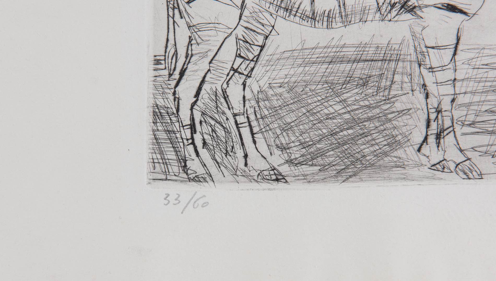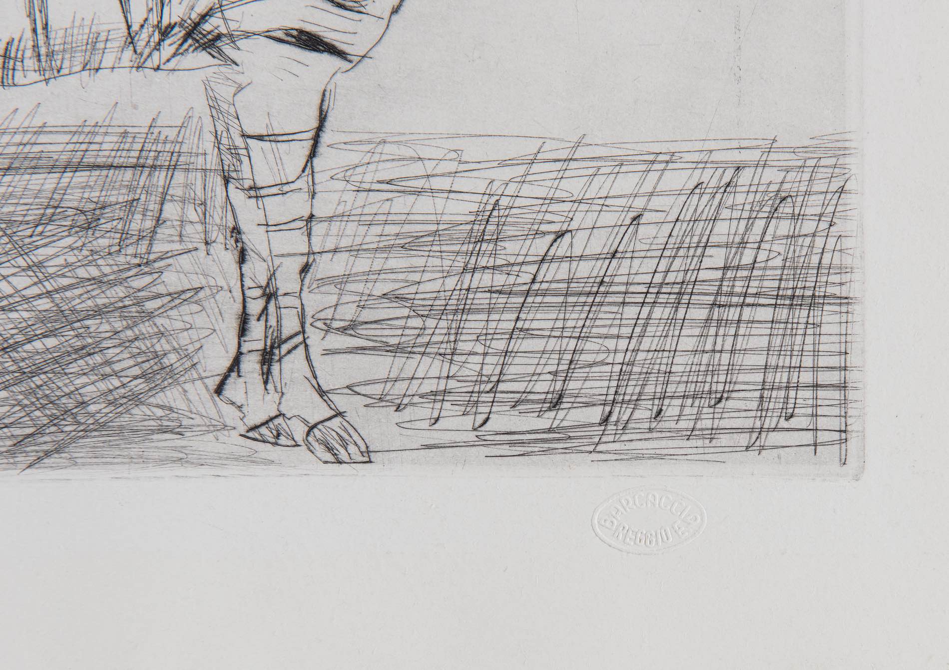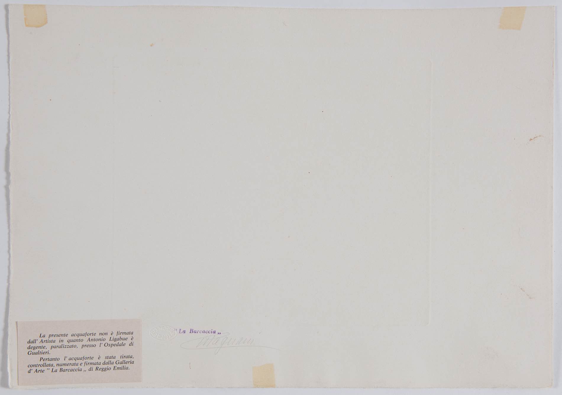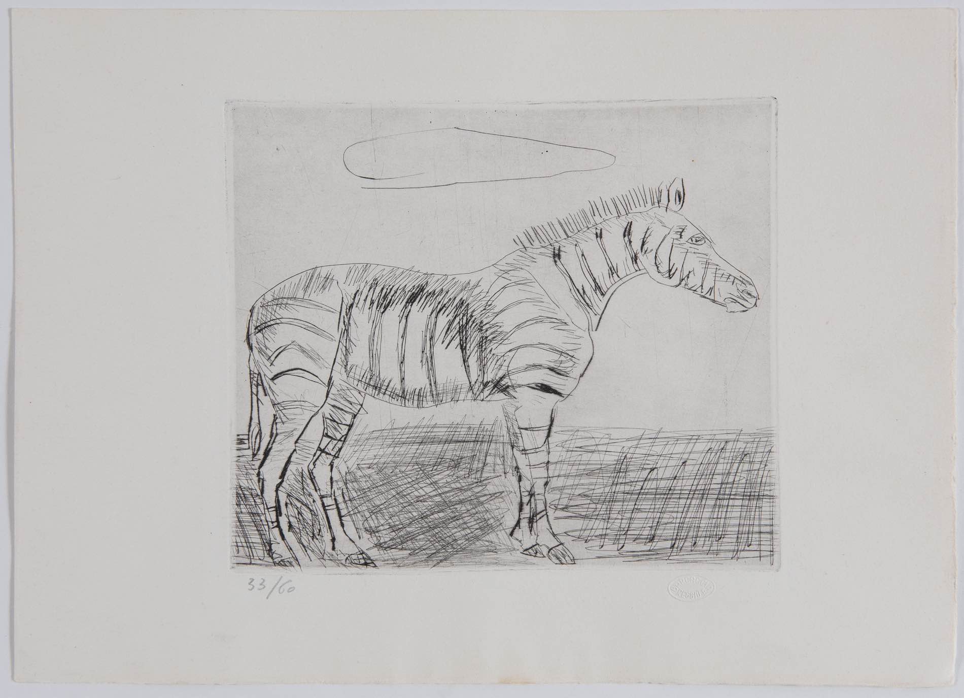 Antonio Ligabue (Zurigo 1899 - Gualtieri 1965), “Zebra”. - Puntasecca su carta, numero di tiratura in basso a sinistra 33/60, timbro a secco Barcaccia Reggio E, Foglio H cm 18x20 - Lastra H cm 25x35 Al retro didascalia, timbro ‘La Barcaccia’ e firma.
