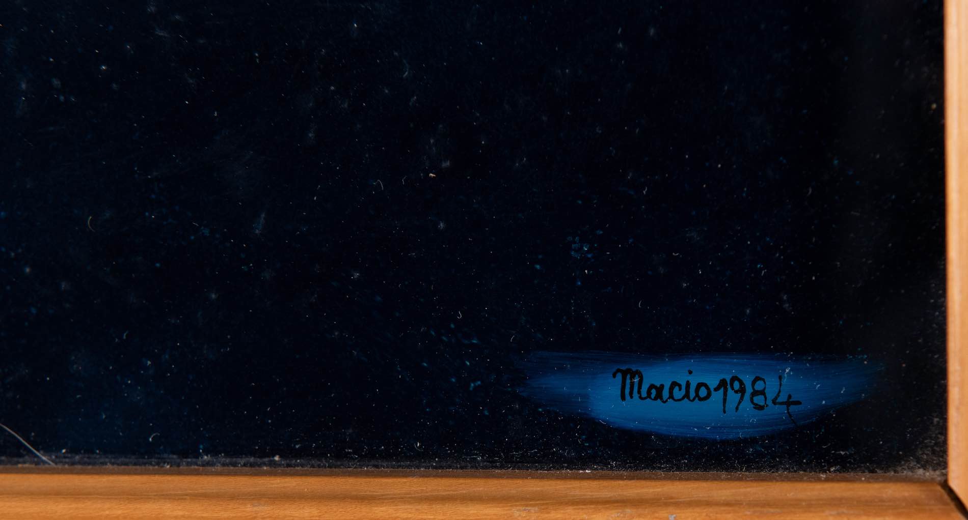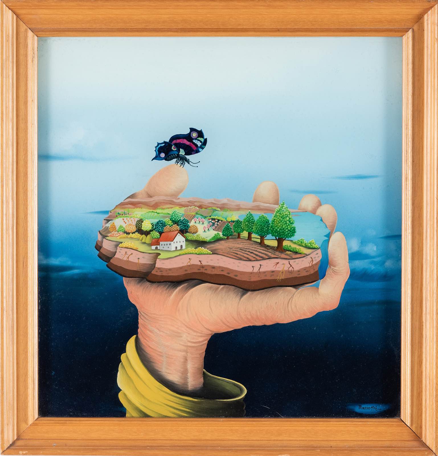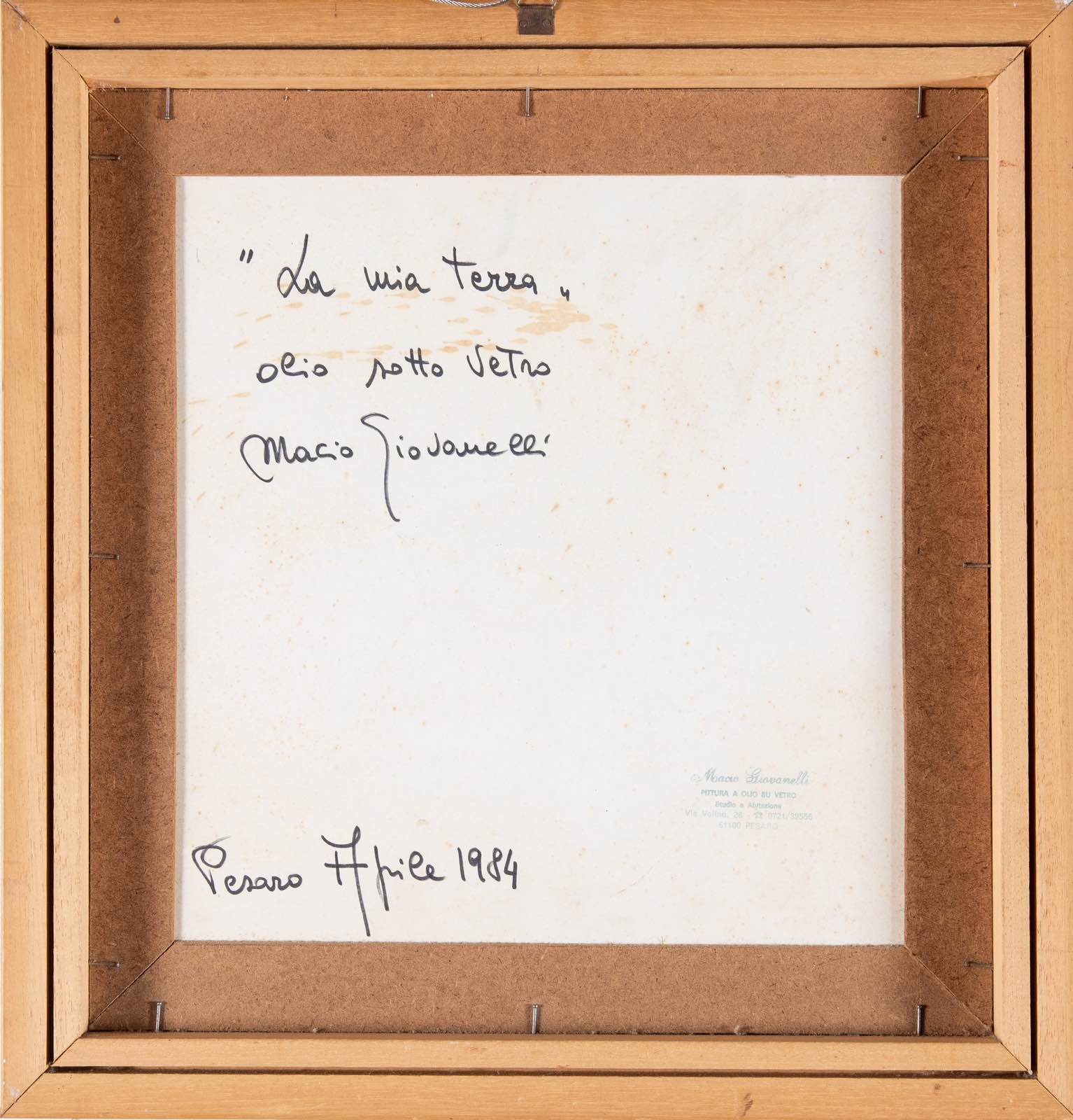 Macio Giovanelli (Pesaro 1946), “La mia terra”, 1984. - Olio su vetro, firmato e datato in basso a destra Macio 1984, al retro titolo, tecnica, firma e data ‘La mia terra/olio sotto vetro/Macio Giovanelli/Pesaro Aprile 1984’, H cm 39x38 Al retro reca timbro Macio Giovanelli. Provenienza: Collezione Bolondi - Luzzara.