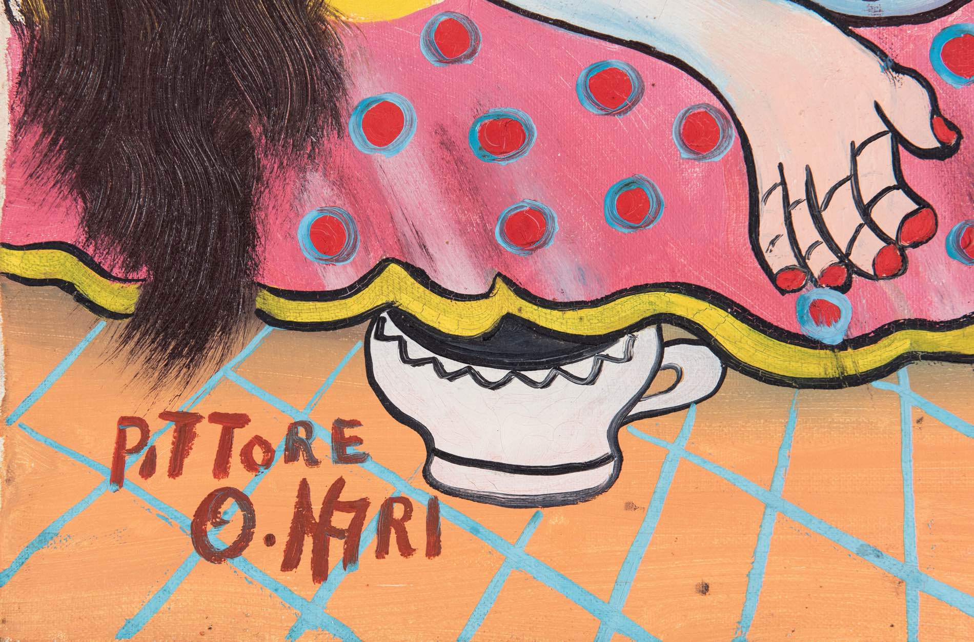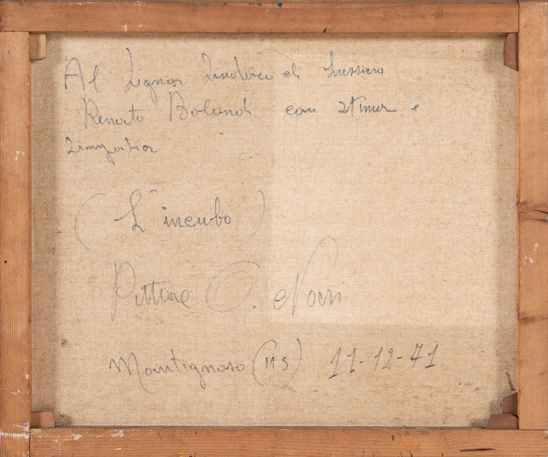 Ottaviano Nari (Montignoso 1925 - 2002), “L’incubo”, 1971. - Olio su tela, firmato in basso a sinistra Pittore O. Nari, al retro titolo, firma e data ‘(L’incubo)/Pittore O. Nari/Montignoso (MC) 11-12-71’, H cm 50x60 Al retro dedica a Renato Bolondi. Provenienza: Collezione Bolondi - Luzzara.