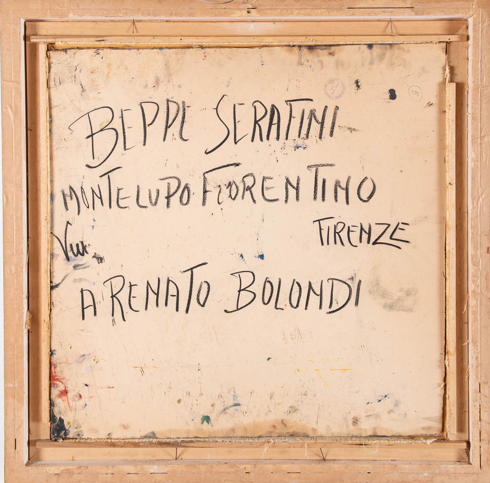 Beppe Serafini (Montelupo Fiorentino 1915 - 1987), “Senza titolo”, 1972. - Tecnica mista su cartone, firmato e datato in basso a destra Serafini 72, al retro firma Beppe Serafini/Montelupo Fiorentino Firenze, H cm 70x70 Al retro reca timbro ‘Ai Frati’ Internazionale Camaiore - Org. Vittorio Grotti’ e dedica a Renato Bolondi. Provenienza: Collezione Bolondi - Luzzara.