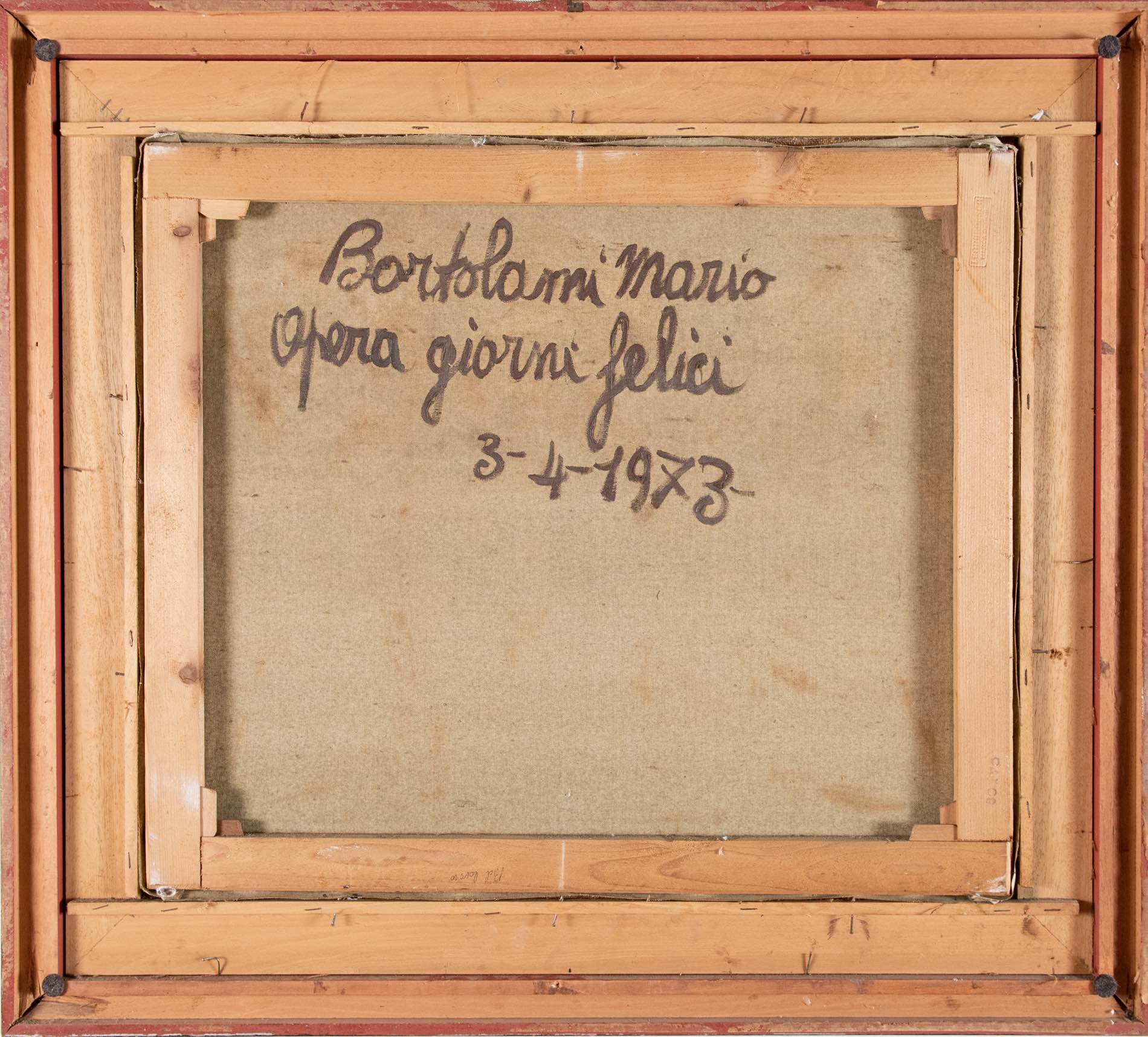 Mario Bortolami (Voltabarozzo 1924 - 2001), “Giorni felici”, 1973. - Olio su tela, firmato in basso a destra M. Bortolami, al retro firma, titolo e data ‘Bortolami Mario/opera giorni felici/3-4-1973’, H cm 60x70 Provenienza: Collezione Bolondi - Luzzara.