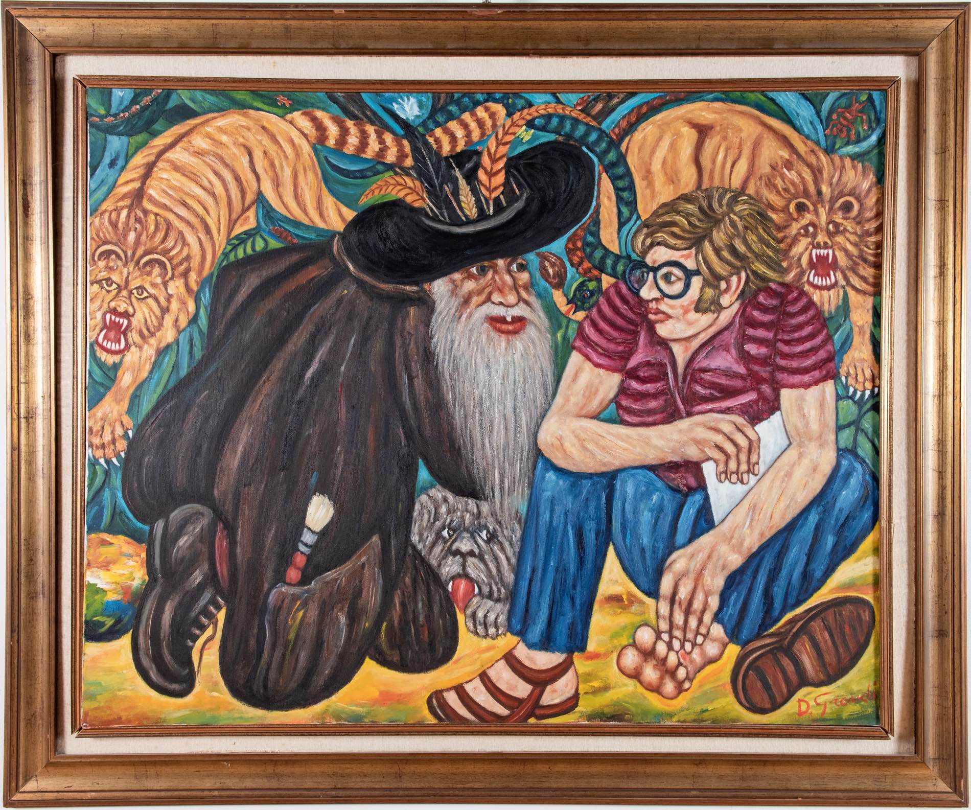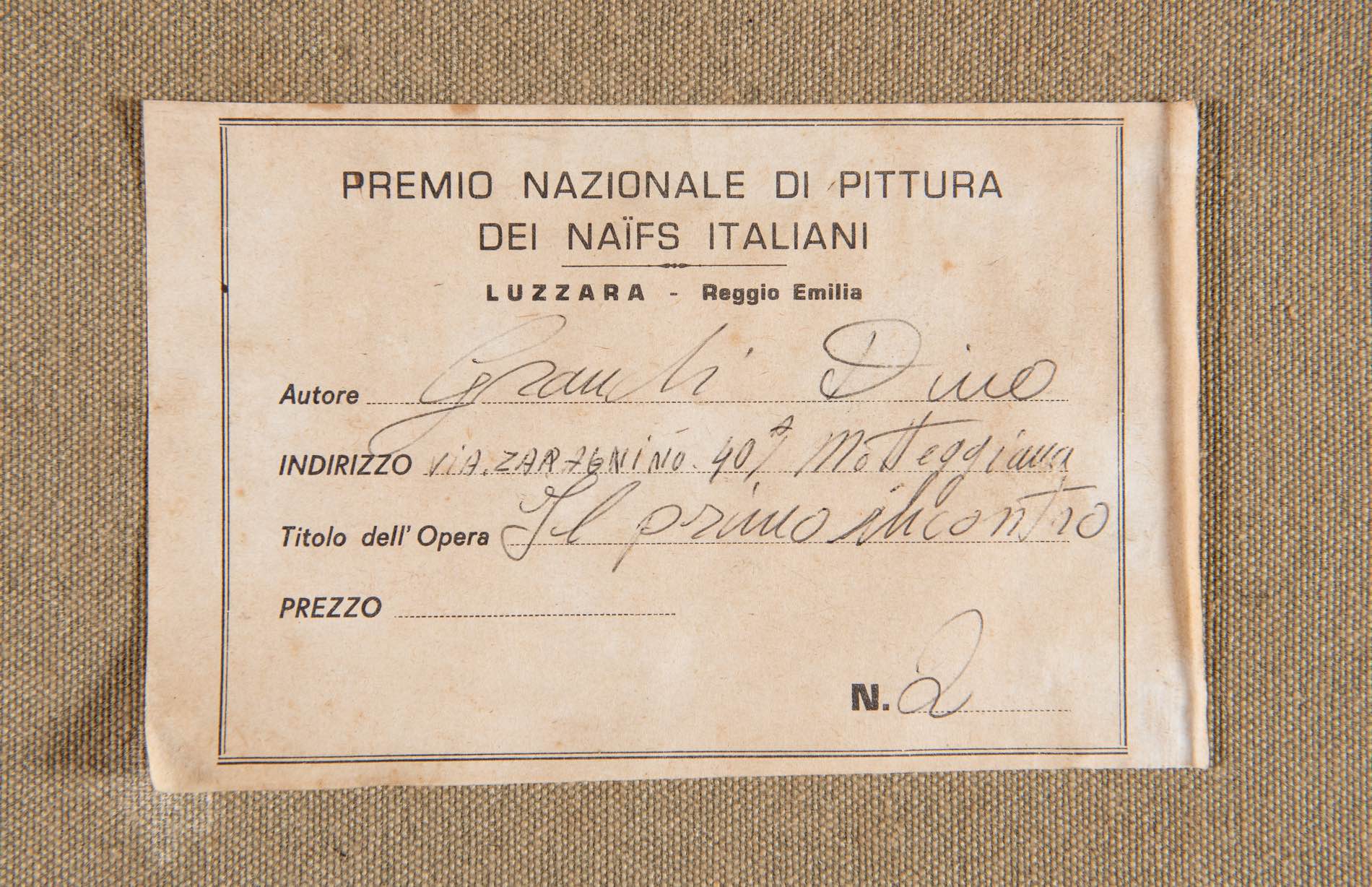 Dino Grandi (Pittore Naif del XX secolo), “Il primo incontro”. - Olio su tela, firmato in basso a destra D. Grandi, H cm 80x100 Al retro reca etichetta Premio Nazionale di Pittura dei Naifs Italiani - Luzzara Reggio Emillia. Provenienza: Collezione Bolondi - Luzzara.