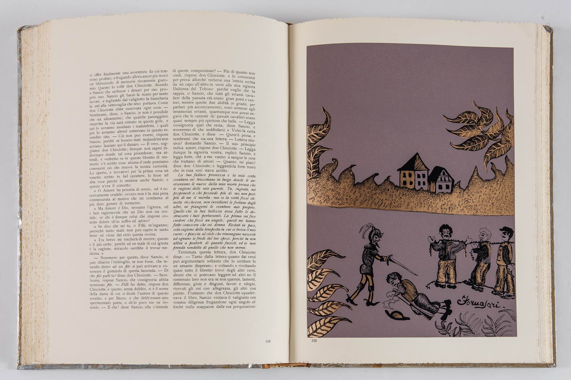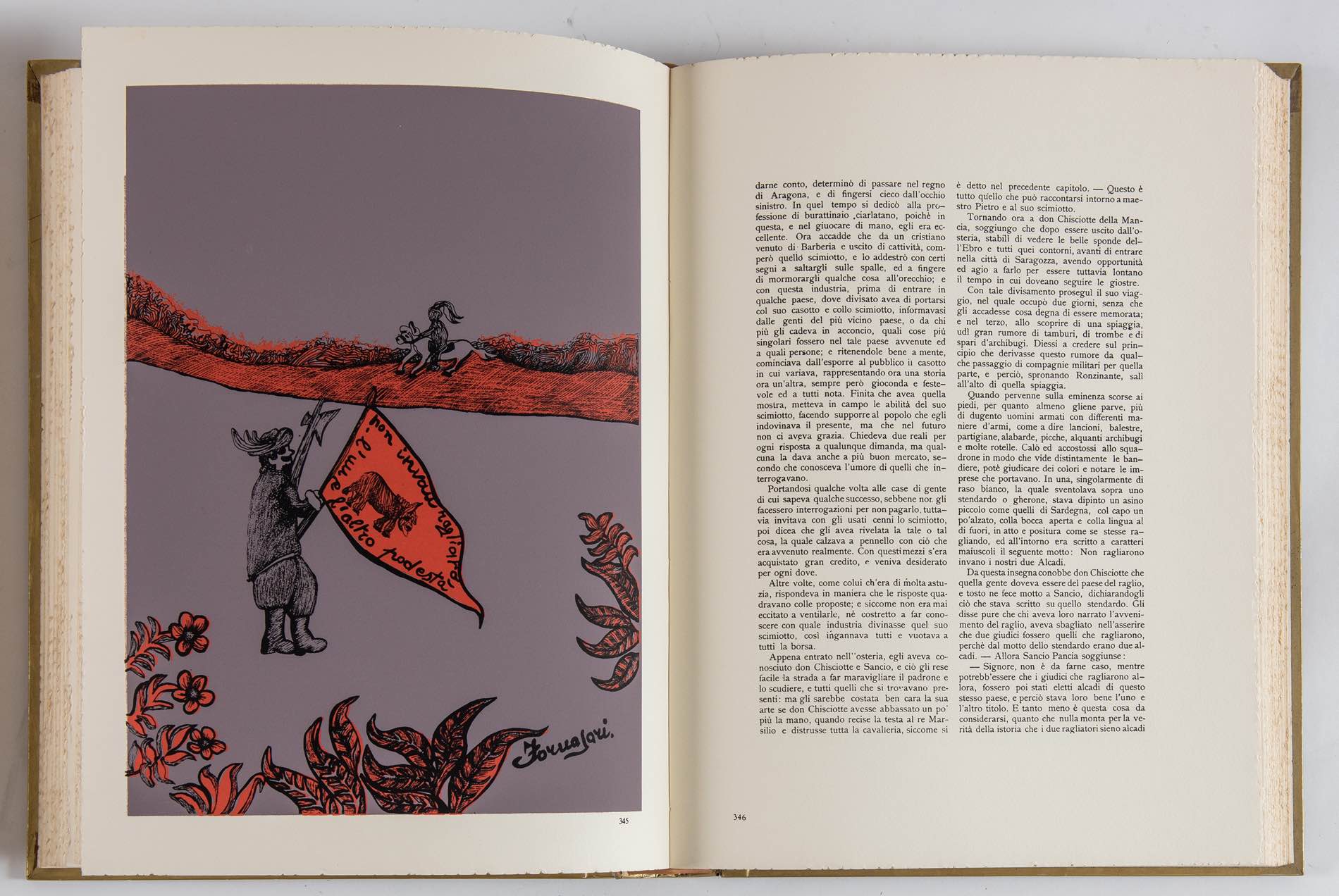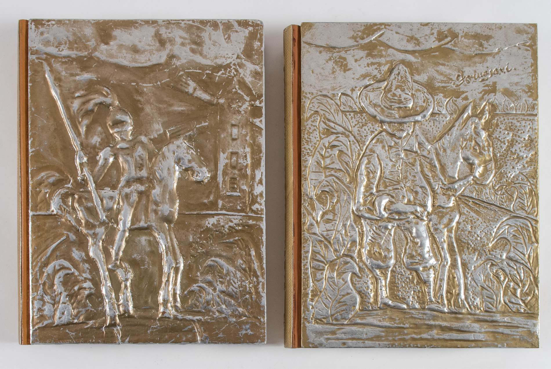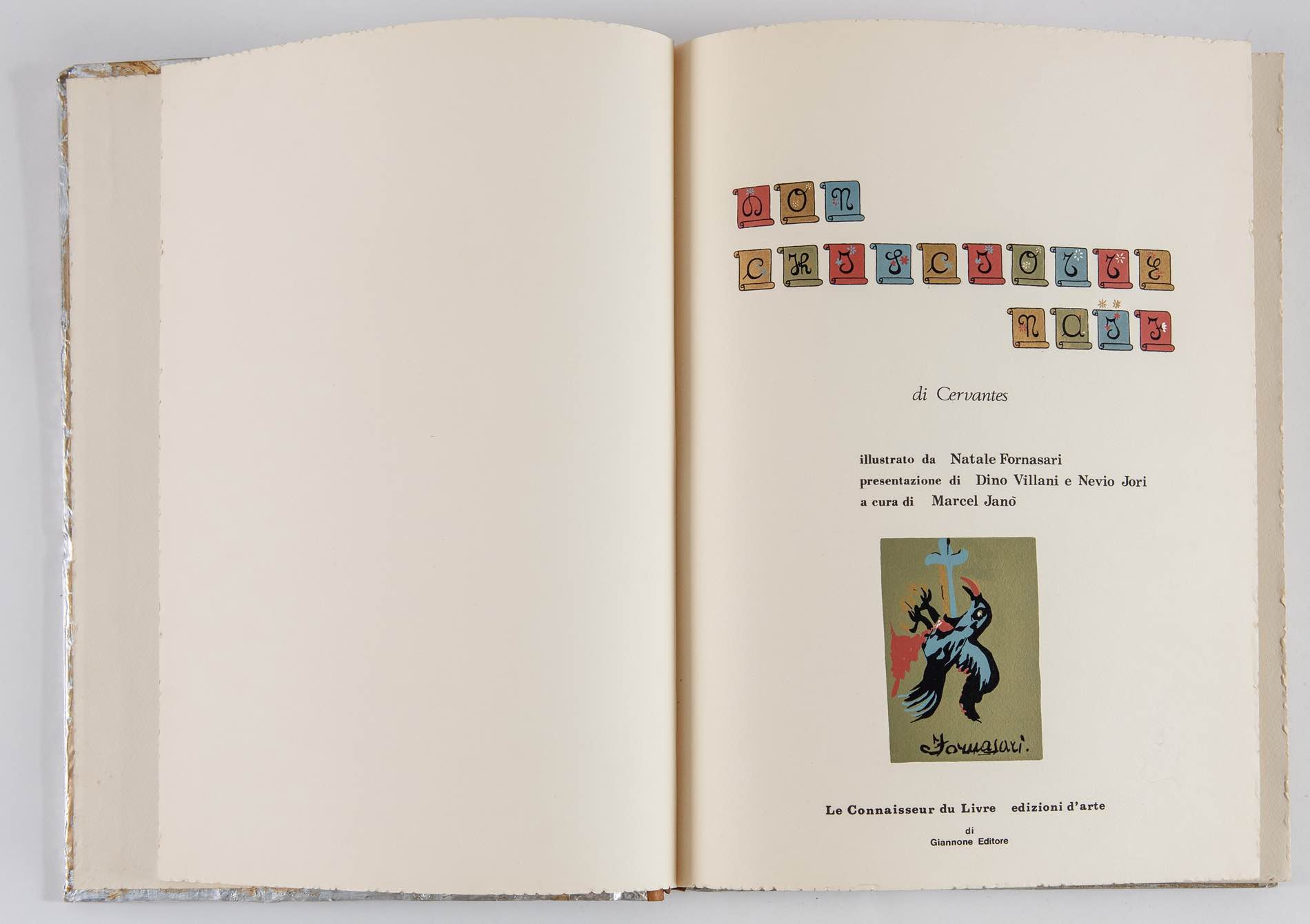 Natale Fornasari (XX secolo), “Don Chisciotte Naif”, 1975. - Opera in due volumi illustrati da Natale Fornasari, con presentazione di Dino Villani e Nevio Jori, a cura di Marcel Janò, Edizioni, LE Connaisseur du Livre edizioni d’arte di Giannone Editore, Milano, copertine in alluminio dorate e sbalzate da lastra di bronzo, esemplare 661, H cm 42x32 Provenienza: Collezione Bolondi - Luzzara.
