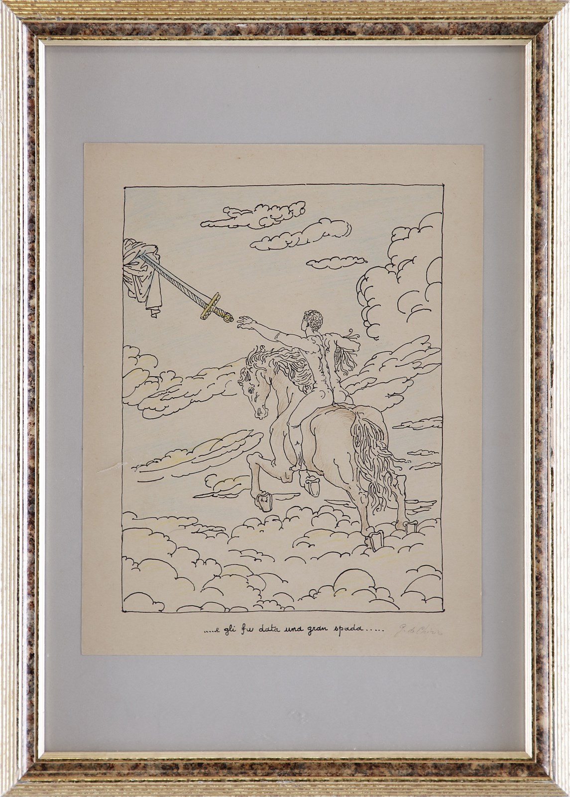 DE CHIRICO GIORGIO (1888 - 1978) E gli fu data una grande spada. 1941. Litografia ritoccata a mano. Cm 27,00 x 35,00. Titolo in basso al centro. Firma a matita in basso a destra. Foglio proveniente dal volume 'L'Apocalisse', Edizioni della Chimera, Milano. Stampatore: Officina d'Arte grafica A.Lucini & C. Pubblicazione: Catalogo ragionato dell' Opera grafica 1921 - 1969, Edizioni Bora, Bologna, 1996, pag. 160 tav.108. Certificato di autenticità di FBArte. Lievi difetti. Cornice presente