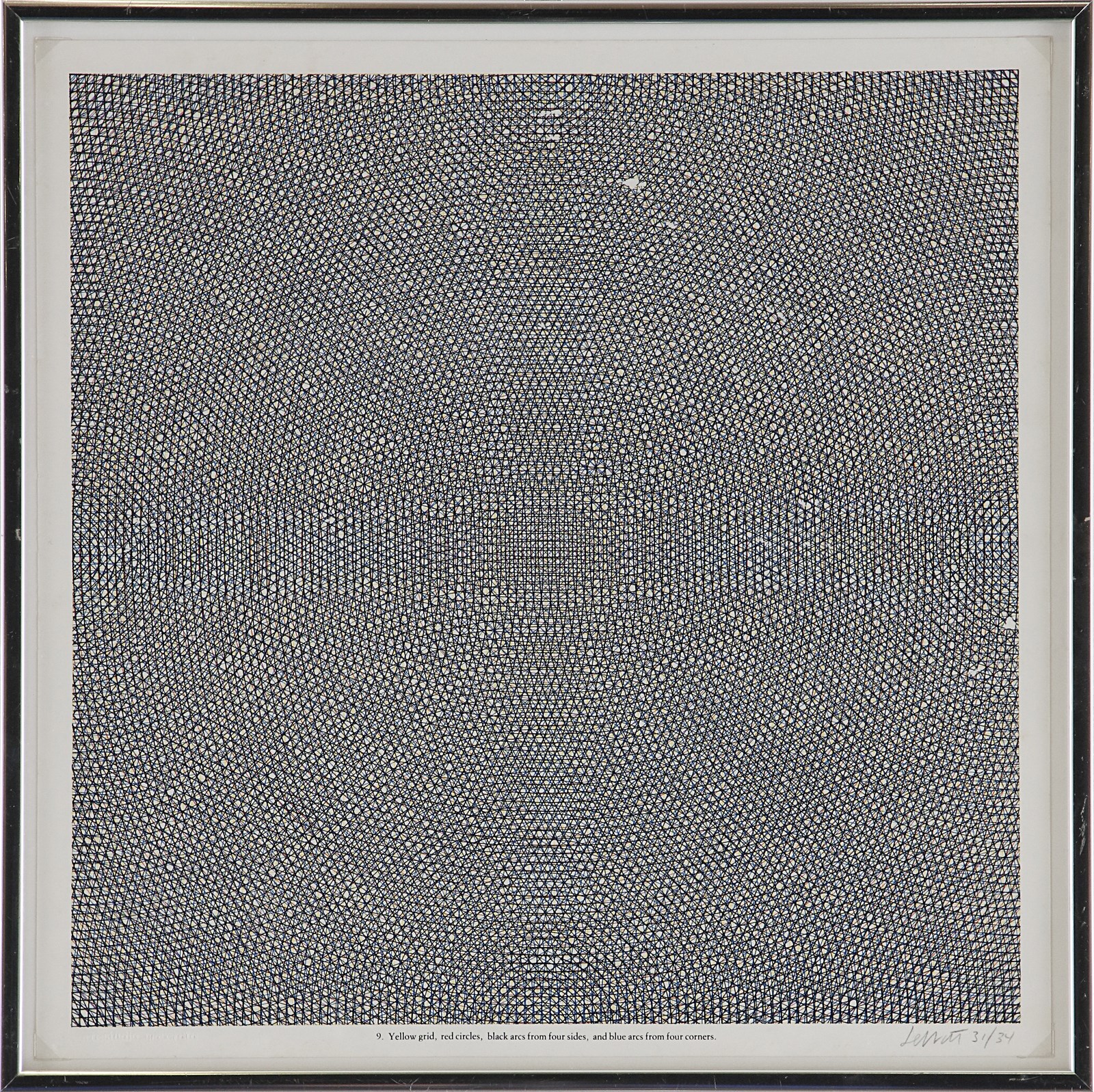 LEWITT SOL (1928 - 2007) Yellow grid, red circles, black arcs from four corners. 1972. Serigrafia. Cm 38,00 x 38,00. 31/34. Tiratura e firma in basso a destra a matita. Titolo in basso al centro. Timbro a secco Artestudio, Macerata, in basso a sinistra. Al retro cartiglio descrittivo Studio La Città, Verona. Cornice presente