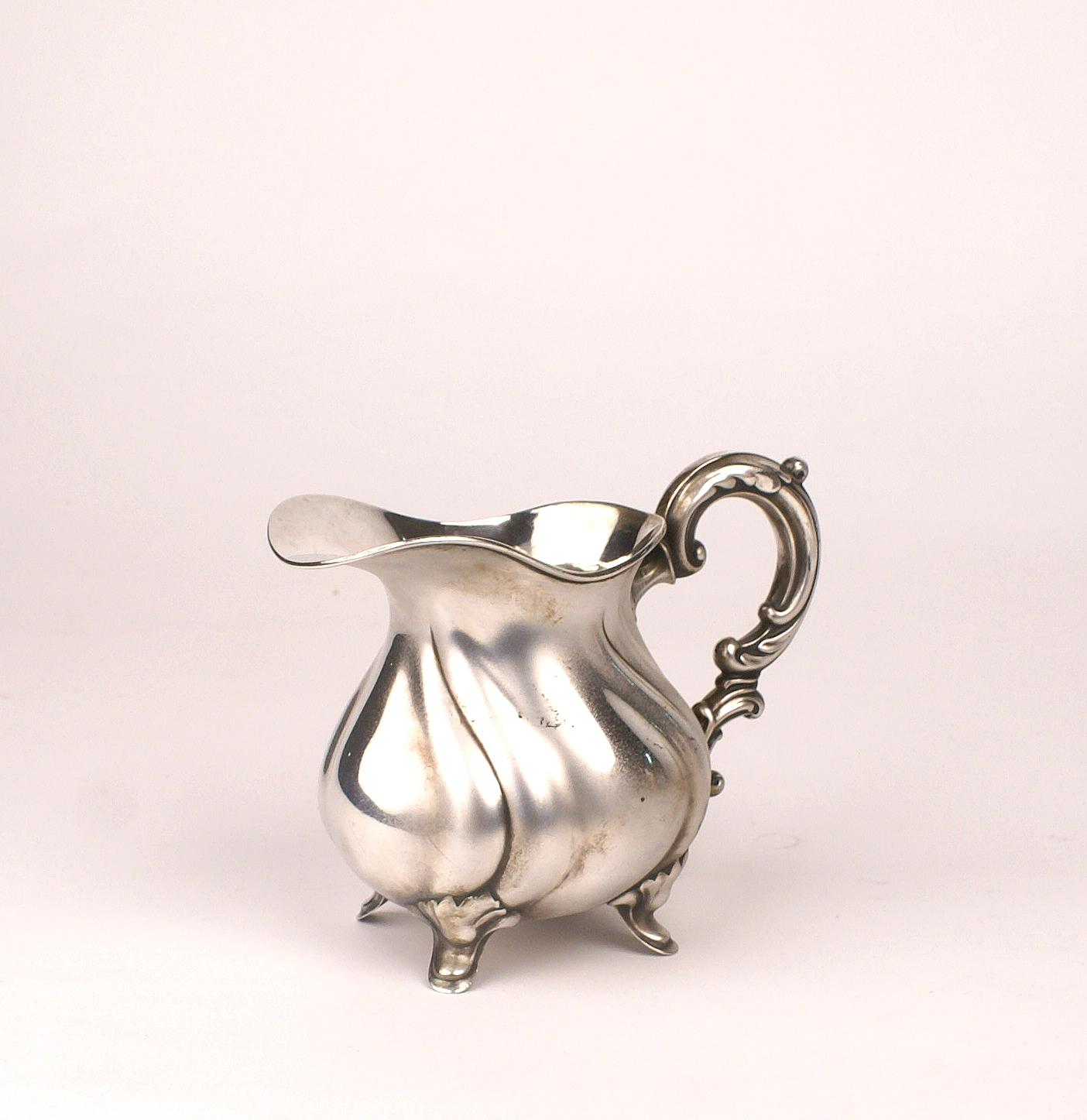 LATTIERA IN ARGENTO Germania vecchia manifattura corpo baccellato e poggiante su quattro piedini manico a voluta, h. cm. 11,5 185 gr.