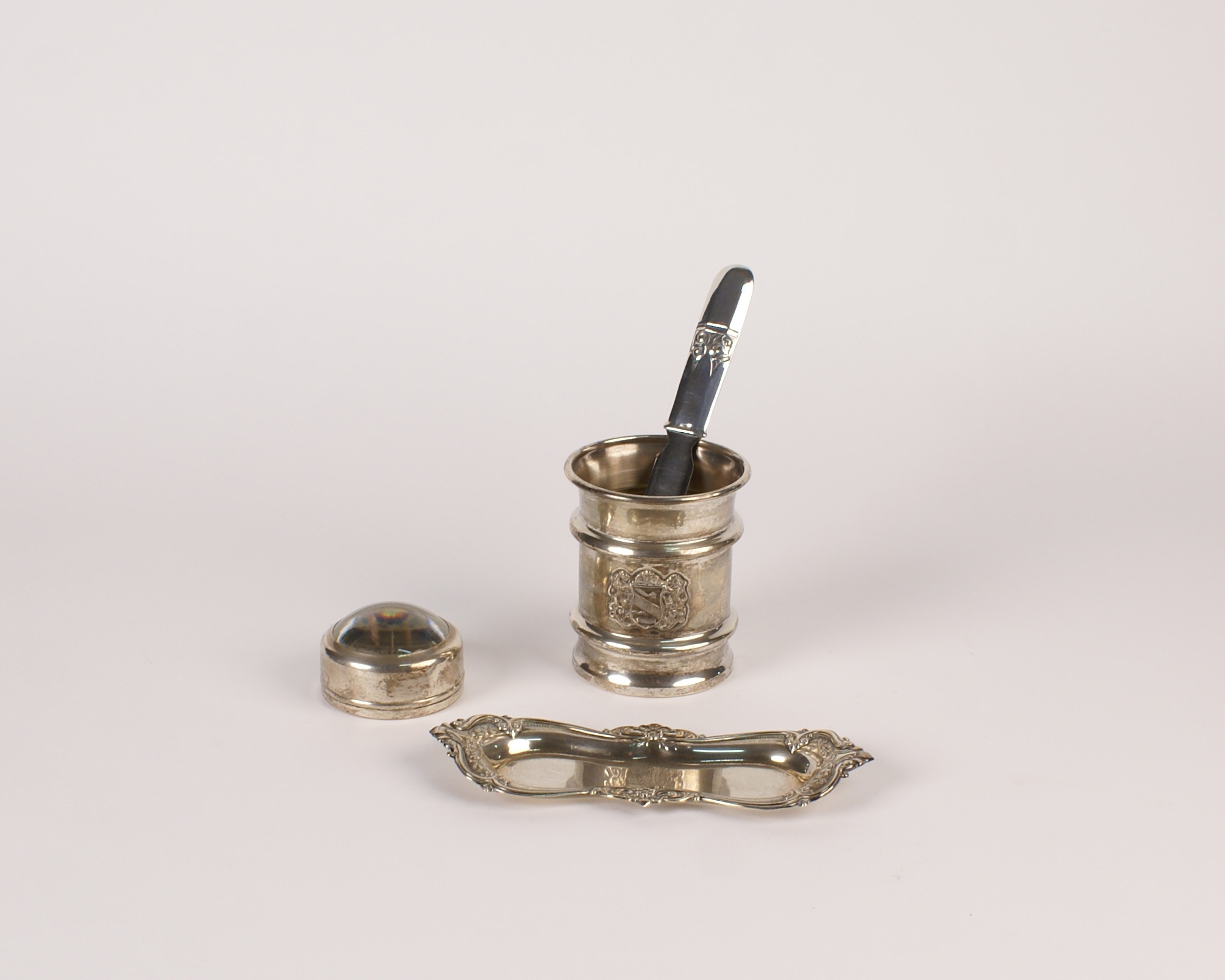 SET DA SCRIVANIA IN ARGENTO fogge e manifatture diverse composto da una lente, un bicchiere portapenne, un piattino e tagliacarte in sheffield 230 gr.