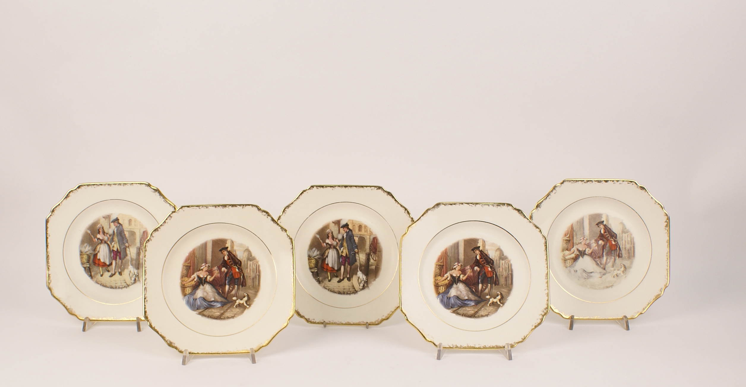 DODICI PIATTINI IN TERRAGLIA HUGHES LONGPORT Inghilterra anni 40/50 dipinti in policromia a raffigurare scene di vita inglese d. 19 cm.