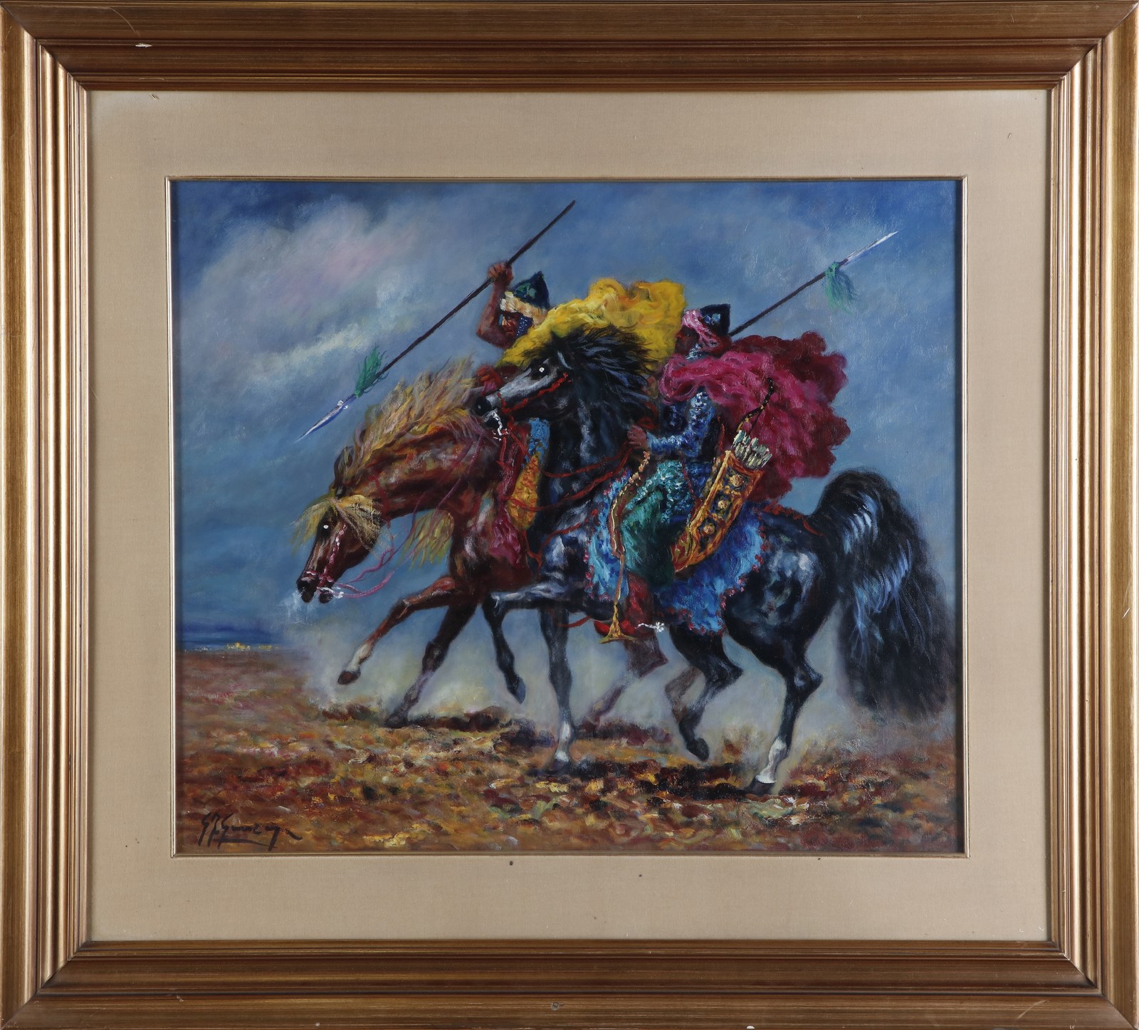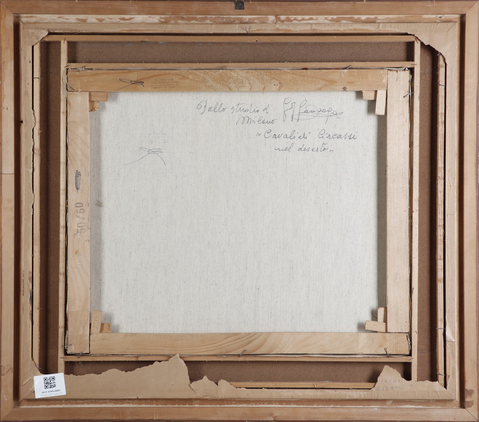 GONZAGA GIOVAN FRANCESCO (1921 - 2007) Cavalieri nel deserto. Olio su tela . Cm 70,00 x 50,00. Firma in basso a sinistra. Al retro titolo e firma. Cornice presente