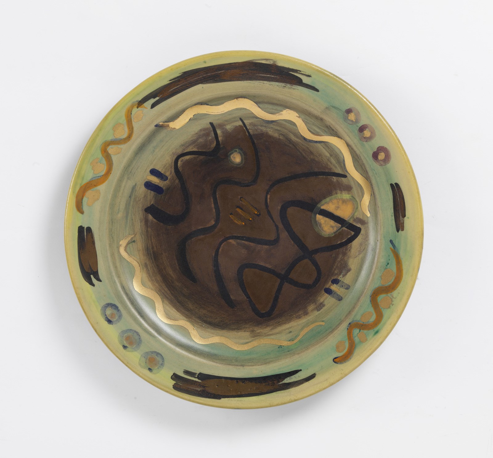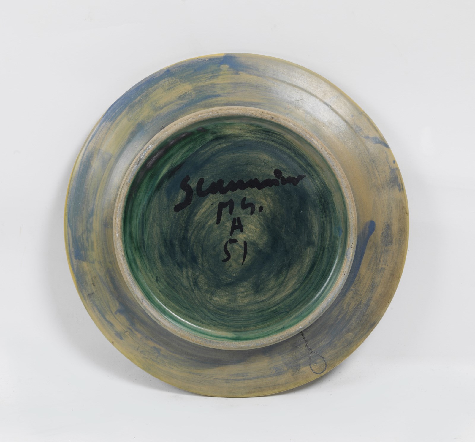 SCANAVINO EMILIO (1922 - 1986) Senza titolo. 1951. piatto. Cm 31,00 x 31,00. Firma e anno sotto la base. Opera visionata e archiviata dall'Archivio Emilio Scanavino, Milano. Tecnica: Terraccotta ingobbiata policroma, smalti metallici ed interventi pittorici.