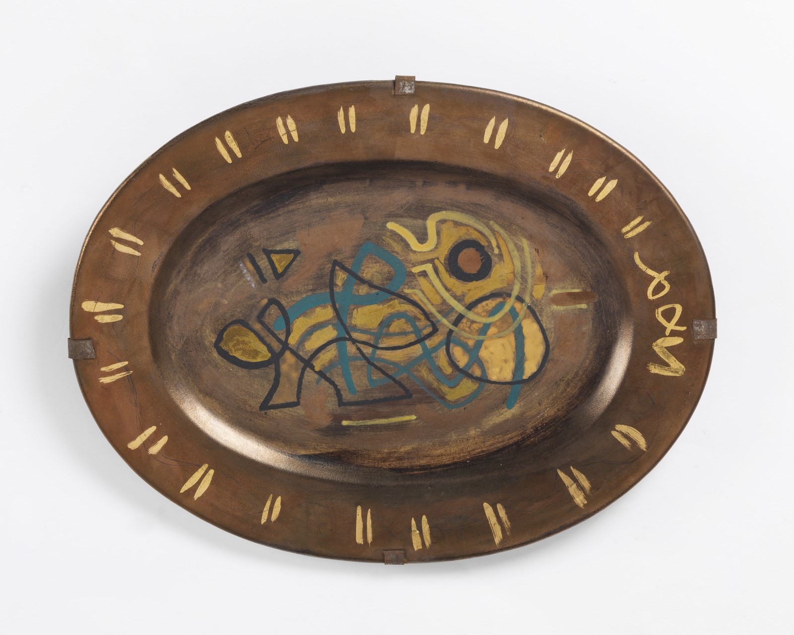 SCANAVINO EMILIO (1922 - 1986) Senza titolo. 1951. piatto. Cm 25,00 x 33,00. Firma e anno sotto la base. Opera visionata e archiviata dall'Archivio Emilio Scanavino, Milano. Tecnica: Terraccotta ingobbiata policroma, smalti metallici ed interventi pittorici.