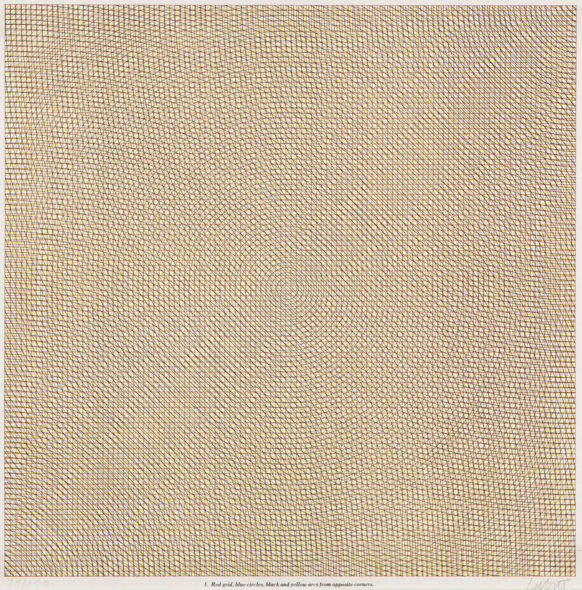 SOL LEWITT Red grid, blue circles, black and yellow arcs from opposite corners