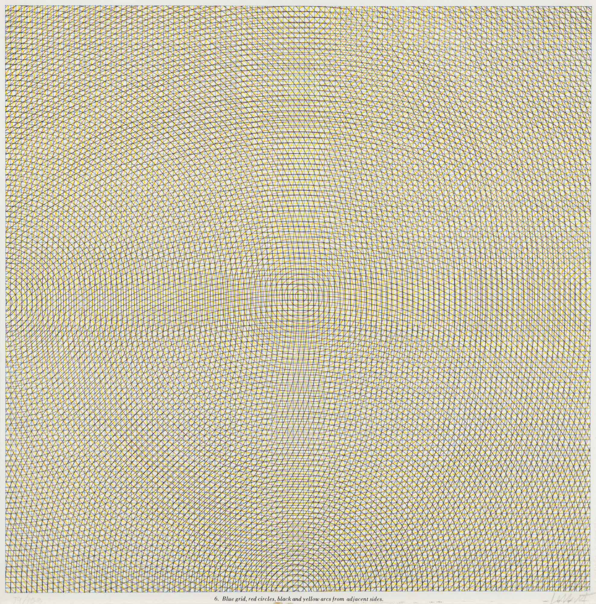 SOL LEWITT Blue grid, red circles, black and yellow arcs from adjacent sides