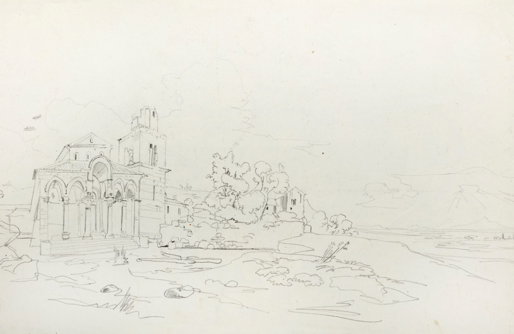 Sul retro, altro disegno con antica chiesa con campanile e pianura sullo sfondo