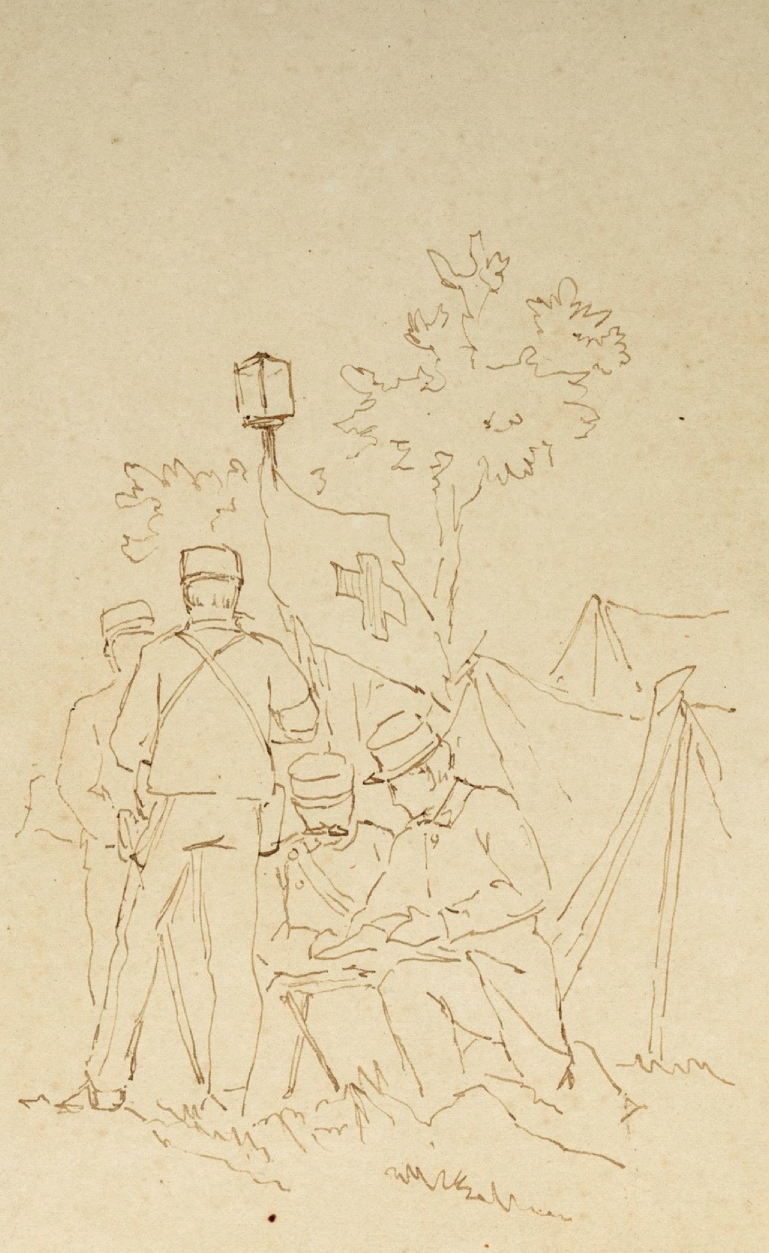 Sul retro, altro disegno di mano dell'artista raffigurante soldati nei pressi di un ospedale da campo.