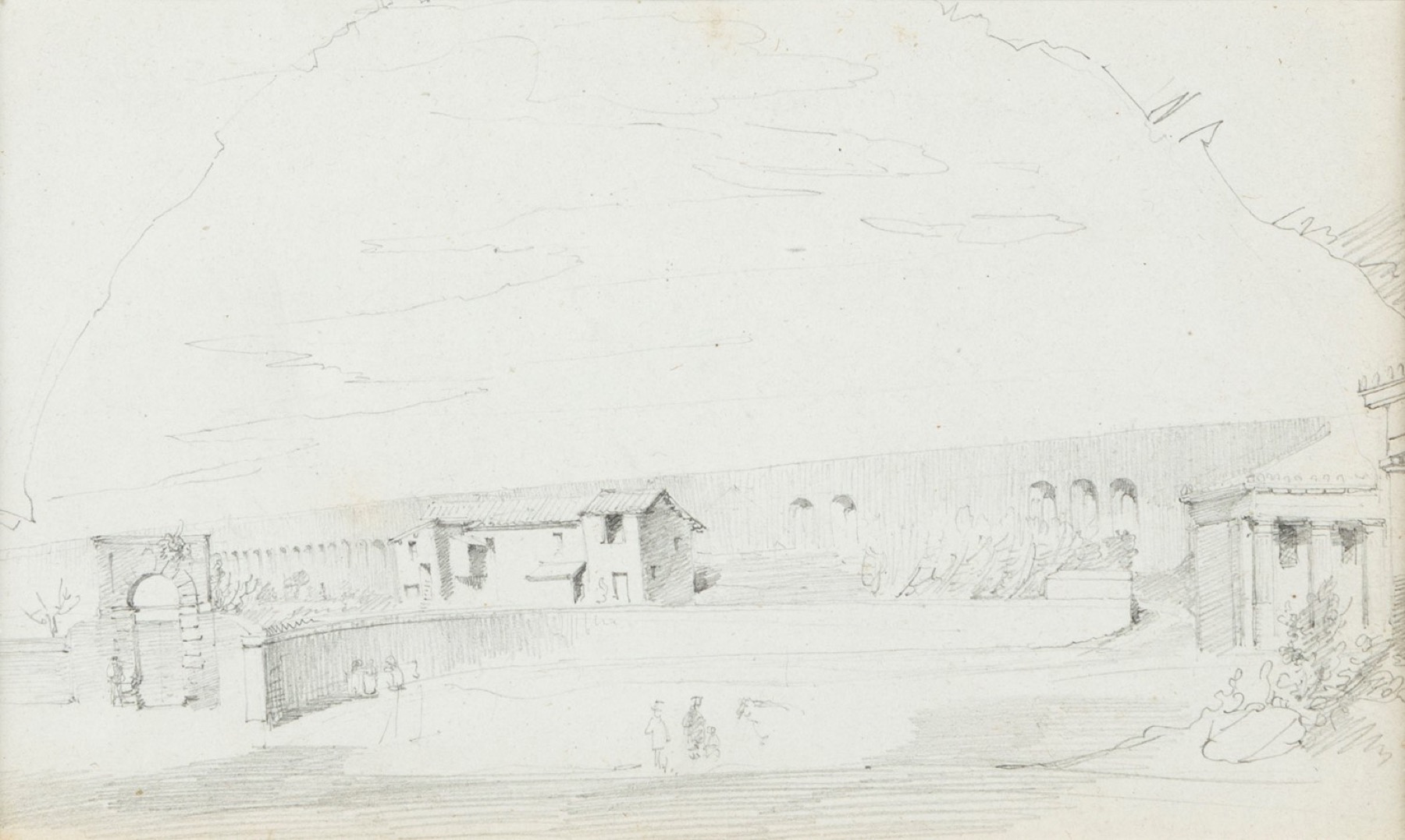 Insieme nel lotto, altro disegno di mano dell'artista raffigurante Veduta di Porta San Giovanni e delle Mura Aureliane a Roma, matita su carta, cm 9 x 15,2.