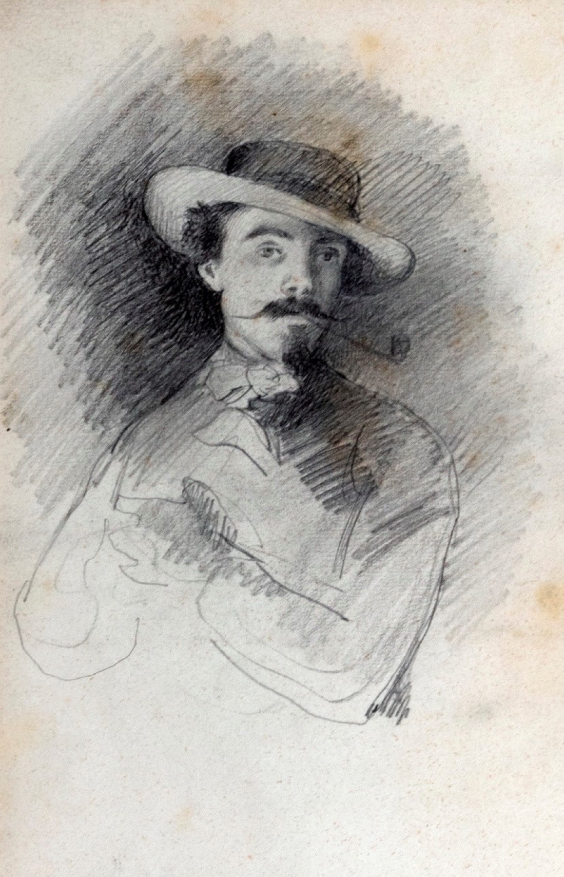 Cesare Maccari (Siena 1840-Roma 1919) - Ritratto di giovane uomo con cappello e pipa