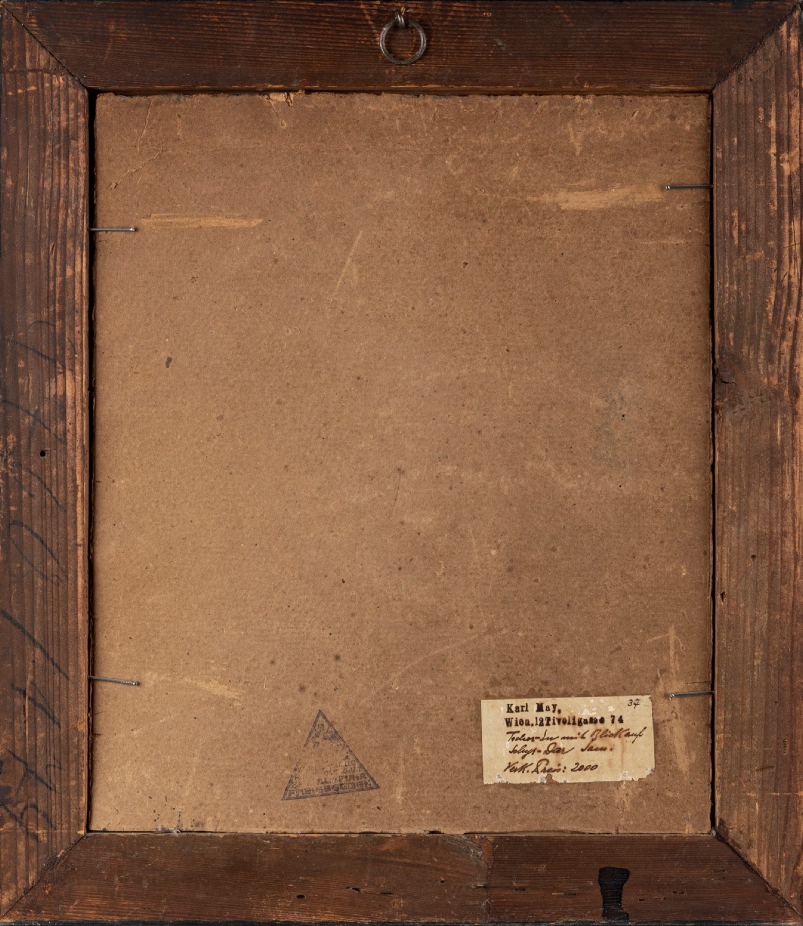 Sul retro, sul cartone di supporto, antico cartellino con nome e indirizzo del pittore, titolo dell'opera, numero di riferimento (36) e prezzo (2000); antico timbro in lingua tedesca.