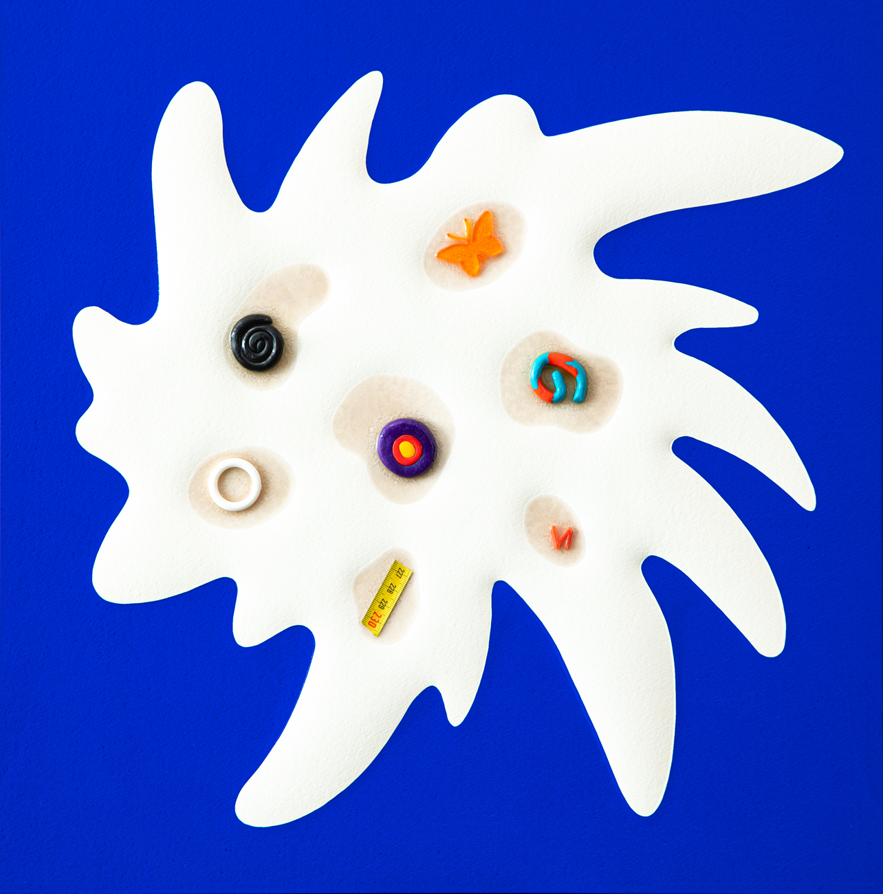 Resine, oggetti, colore serigrafico, carta, legno su faesite