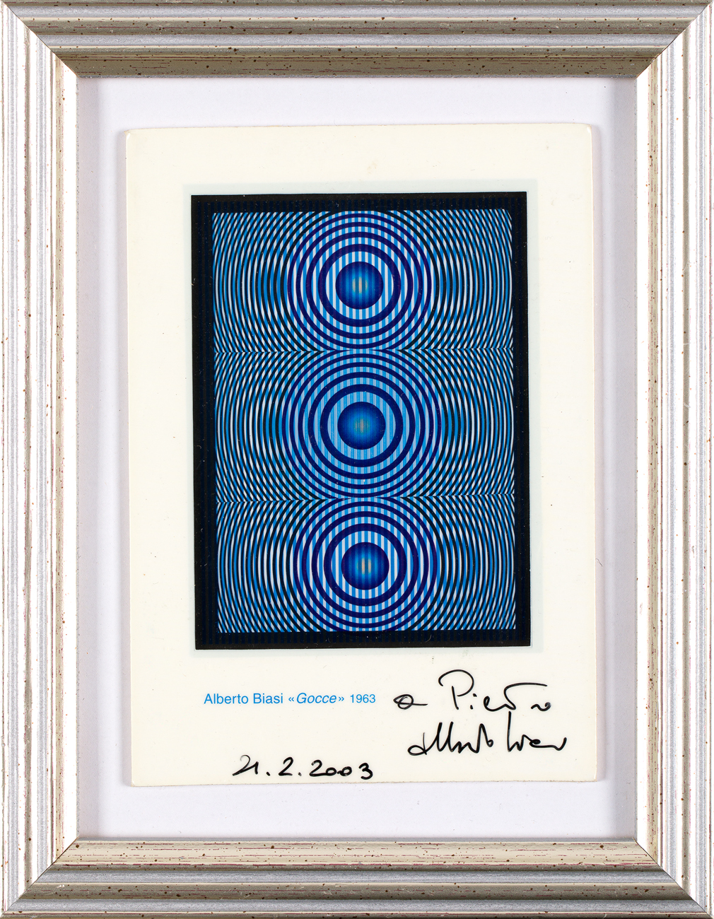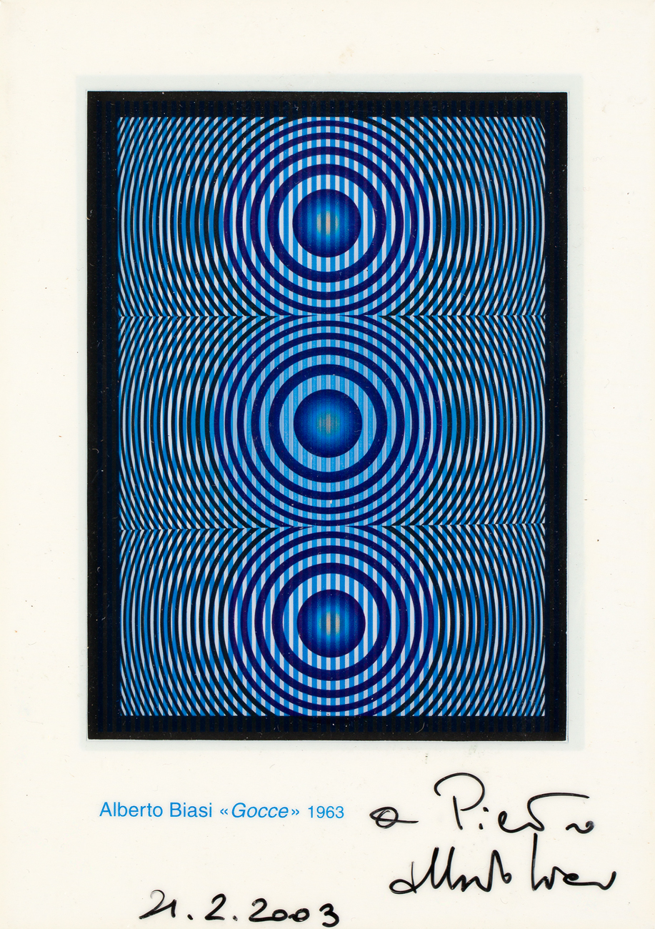 Cartolina cartonata, raffigurante un'opera dell'Artista del 1963, edita in occasione dell'esposizione 'Luce movimento & programmazione - Kinetische Kunst aus Italien 1958-1968'