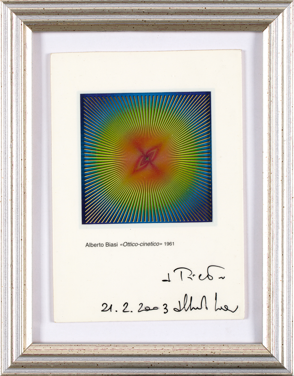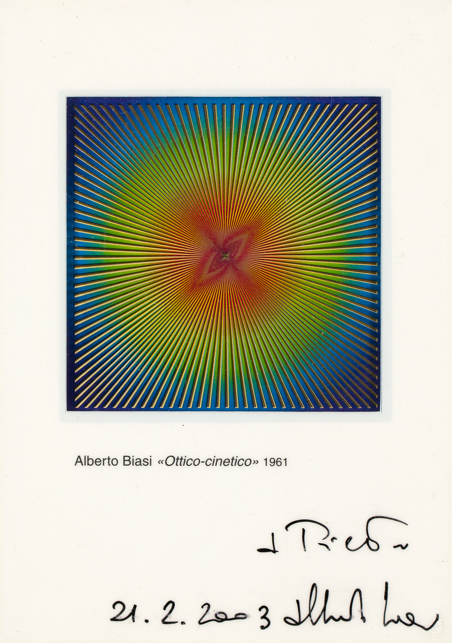 Cartolina cartonata, raffigurante un'opera dell'Artista del 1961, edita in occasione dell'esposizione 'Luce movimento & programmazione - Kinetische Kunst aus Italien 1958-1968'