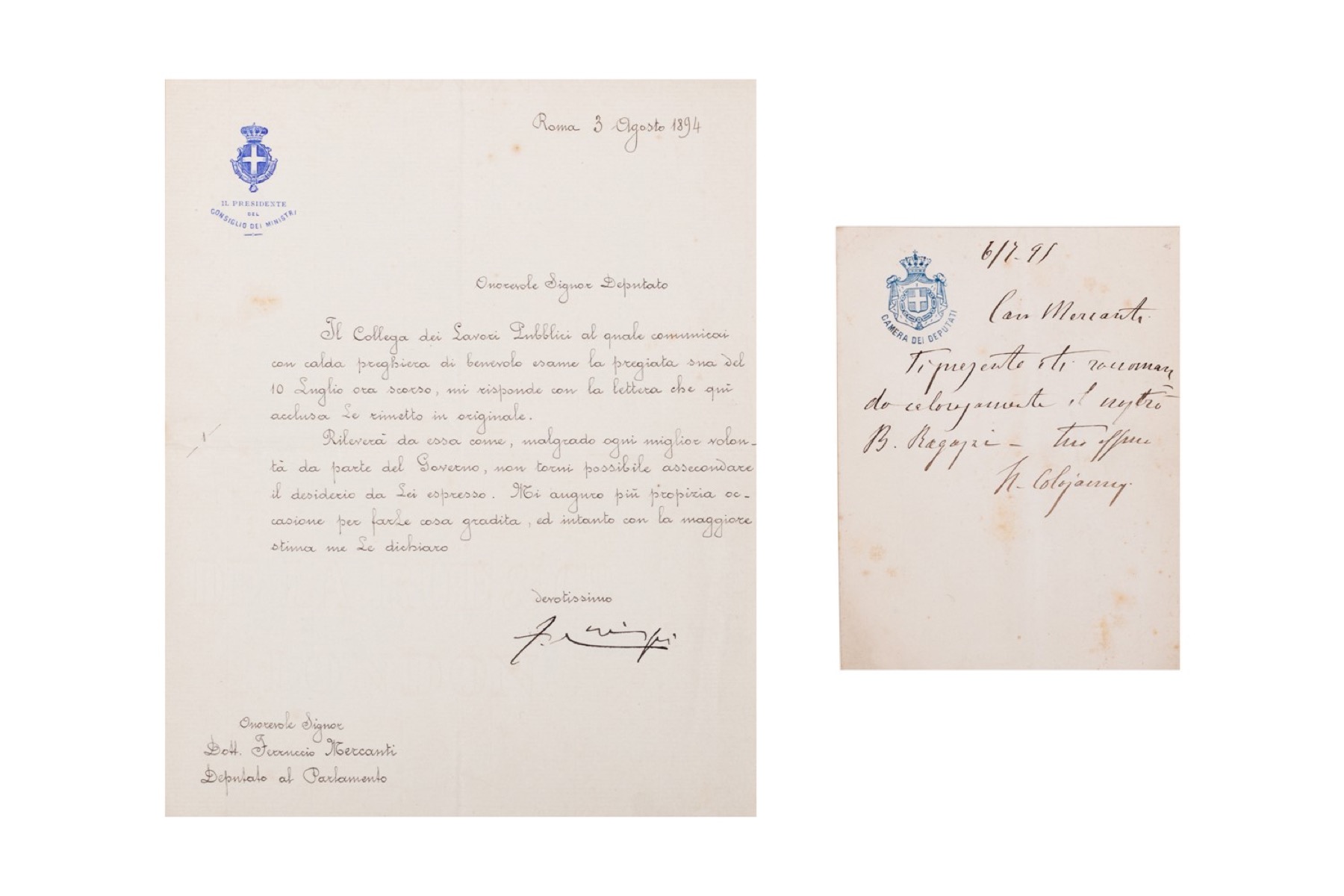 Lettera a.f. di Colajanni a Mercanti, 6 VII 1895; lettera di Crispi a.f. sempre a Mercanti, Roma 3 VIII 1894.