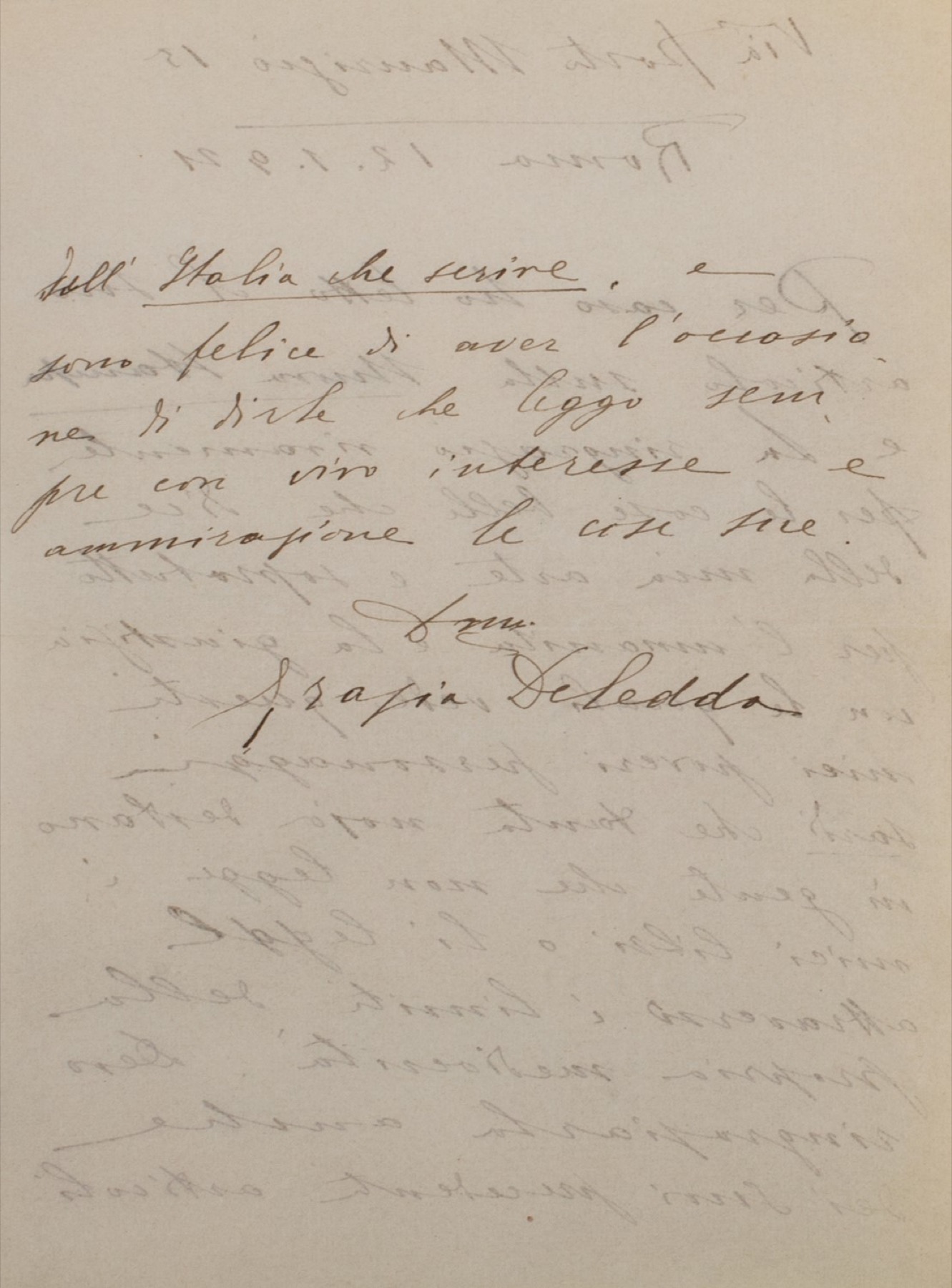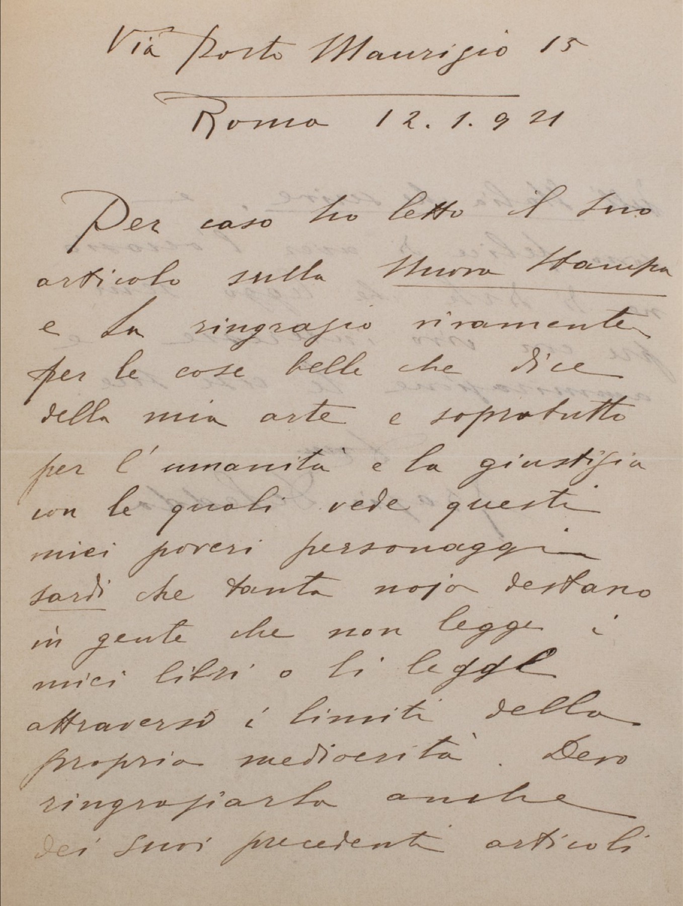 "Per caso ho letto il suo articolo sulla Nuova Stampa e la ringrazio vivamente per le cose belle che dice della mia arte e la giustizia con la quale vede questi miei poveri personaggi sardi che tanta noja destano in gente che non legge i miei libri o li legge attraverso i limiti della propria mediocrità. Devo ringraziarla anche dei suoi precedenti articoli dell'Italia che scrive, e sono felice di aver l'occasione di dirle che leggo sempre con vivo interesse le cose sue. dma Grazie Deledda"