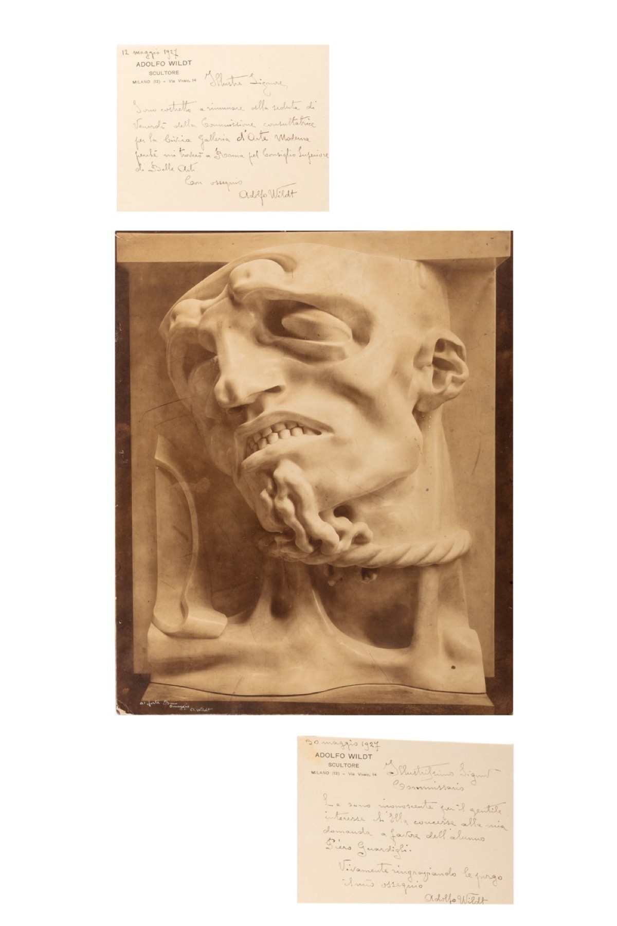 Due cartoncini autografi firmati, datati 12 e 30 maggio 1927, su carta intestata; unita una bellissima foto di un'opera di Wildt dal titolo "Il Prigione", 338 x 275 mm., con dedica al verso: "Al buon Maestro Vittore Grubicij De Dragon, con la solita amicizia. Adolfo Wildt."