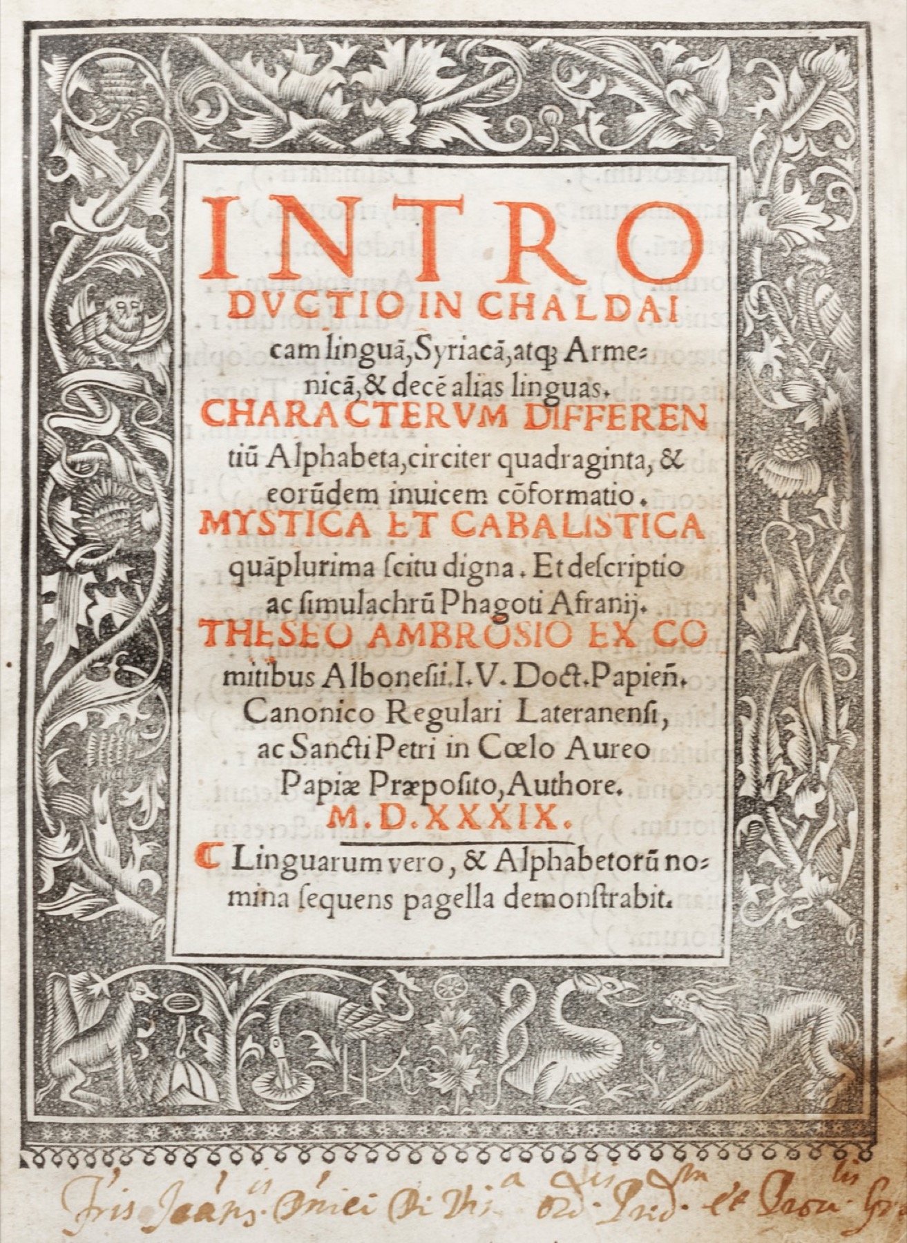 Rara prima edizione su gli studi orientali, importante anche per la storia della musica per la prima descrizione illustrata del fagotto, che lo zio dell'autore, Afranio degli Albonesi, aveva inventato all'inizio del secolo. Il canonico regolare Teseo Ambrogio degli Albonesi (spesso indicato semplicemente come Ambrogio o Ambrosius; 1469-1540) insegnava la lingua siriaca. Questa introduzione alle lingue orientali - la sua unica pubblicazione - è un misto di trattati linguistici e una raccolta di alfabeti esotici. Se i risultati di Albonesi non sono sempre corretti, rimangono di grande importanza per la storia della cultura linguistica: l' "Introductio" costituisce una di quelle opere che hanno ispirato la nascente disciplina della filologia comparata ad intraprendere ulteriori ricerche. "Il suo lavoro offre una panoramica dettagliata delle lingue siriaca e armena da vari punti di vista, e un breve avviso sulle altre lingue esotiche (samaritano, arabo, copto, cirillico, etiope) - queste lingue sono tutte discusse con esempi scritti a mano nei capitoli precedenti, e in tutto il lavoro troviamo spazi vuoti in cui tali parole dovevano ancora essere riempite. In questa copia, questi spazi vuoti sono stati riempiti con inchiostro da una mano contemporanea. Interessanti segni di censura al verso della c. 212, ove si parla di argomento demonologico.