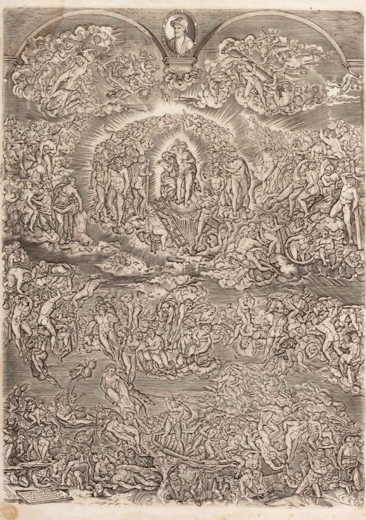 Esemplare della celebre versione incisa dal croato Martino Rota dal capolavoro di Michelangelo, il Giudizio sistino, scoperto nel 1542.