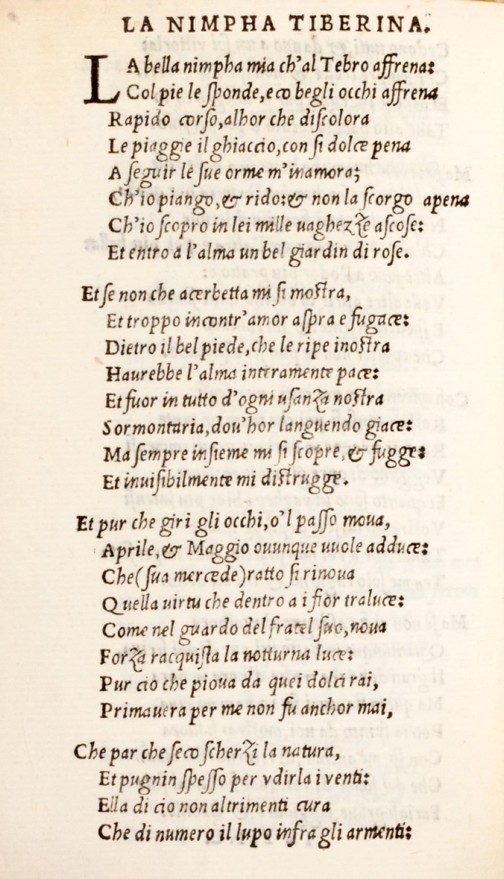 Prima comparsa a stampa dei tre autori, che contiene anche la prima edizione a stampa del poemetto di Molza, La Ninfa Tiberina. Esempio brillante di lirica post-petrarchesca, che si allontana dalla lezione di Bembo per recuperare sovente il patrimonio della lirica classica, virgiliana e catulliana in primis.