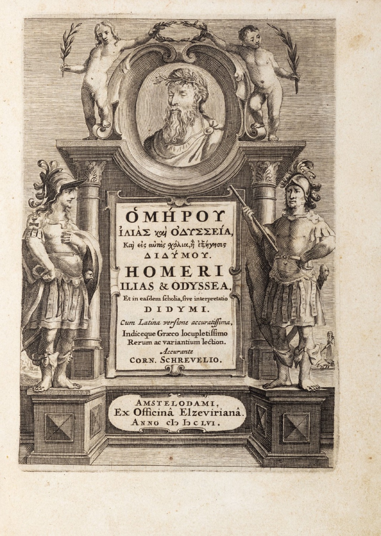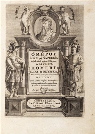 Oberursel, Cornelio Sutor, 1601. In 8°. Marca tipografica al frontespizio, titolo in rosso e nero, ritratto dell'autore e numerose xilografie nel testo, molto brunito, legatura coeva in pergamena floscia, dorso liscio con autore e titolo manoscritti, strappi al dorso. Insieme nel lotto Omero, "Ilias & Odyssea, et in easdem scholia, sive interpretatio Didymi", Amsterdam, 1656, solo l'Iliade.
