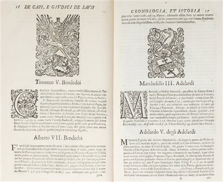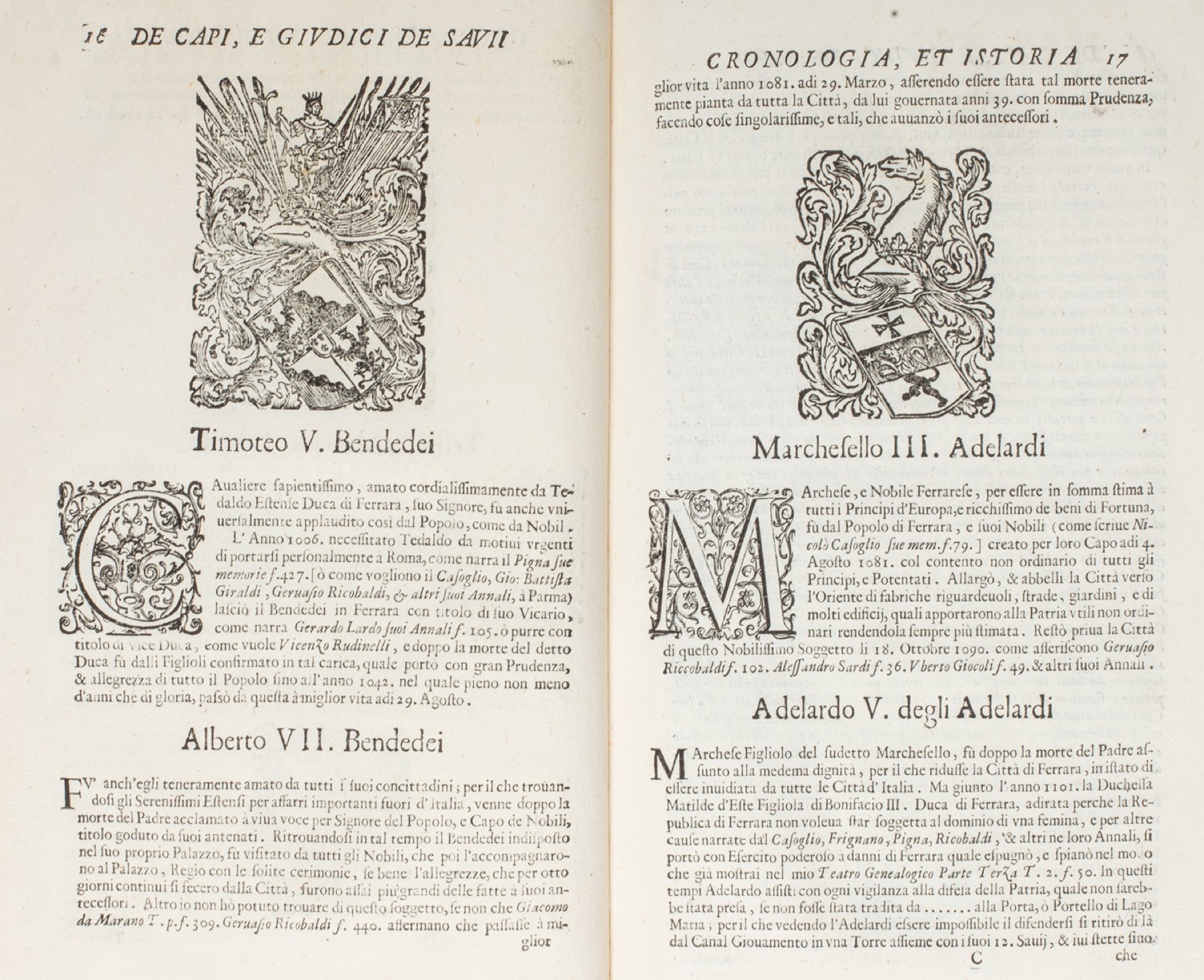 Ferrara, Stamperia Camerale, 1683. In 2°. Frontespizio stampato in rosso e nero con stemma xilografico di papa Innocenzo XI, numerose illustrazioni di stemmi nel testo, iniziali e fregi incisi in legno, frontespizio leggermente brunito e con qualche alone, rare lievi fioriture marginali, legatura coeva in pergamena, autore e titolo impressi in oro al dorso liscio, tagli rossi, qualche lieve alone ai piatti.