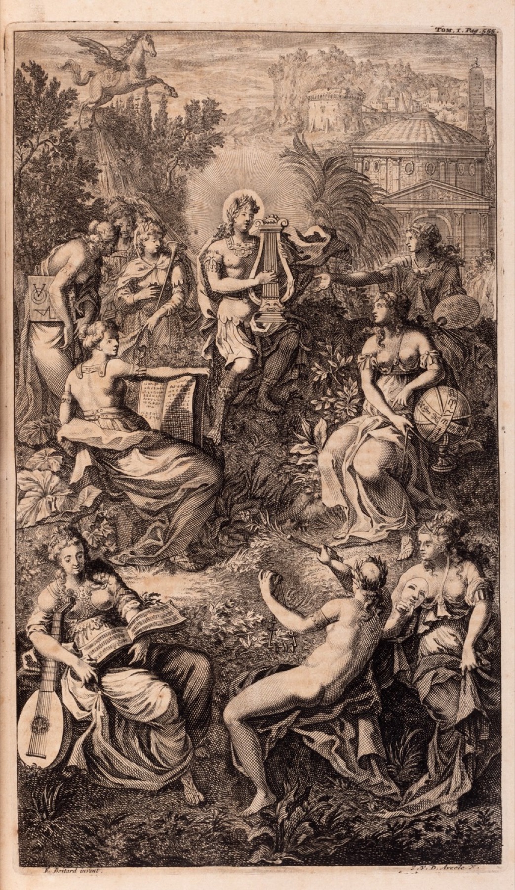 Leida, Hackium, Boutesteyn, Vivie, Vander AA, & Luchtmans, 1696. In 2°. 2 voll. in 1. I parte con occhietto, bella antiporta calcografica e 2 carte ripiegate e 5 a piena pagina fuori testo disegnate da Francois Boitard e incise da Jan van den Areele, II parte completa delle 2 tavole a piena pagina, frontespizi in rosso e nero con marca xilografica, capilettera e finalini incisi in legno, leggera brunitura diffusa, su alcune carte più intensa, lievi fioriture, legatura coeva in pergamena, piatti impressi a secco, autore e titolo manoscritti al dorso a 7 nervi, qualche alone. Nota manoscritta alla carta di guardia.