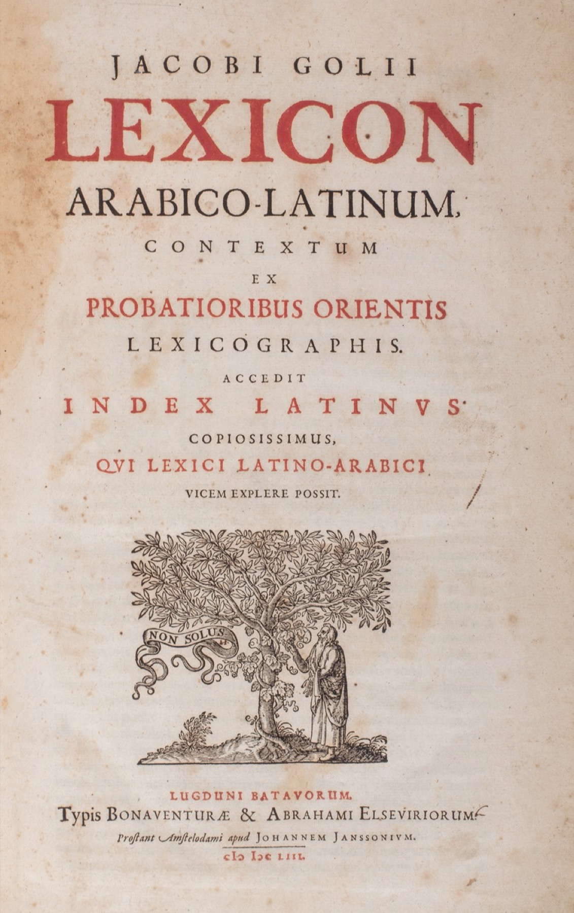 Prima edizione di uno dei più importanti dizionari di lingua araba del sec XVII scritto dal matematico e orientalista olandese Jakob Golius (1596-1667). Rimarrà per i linguisti e studiosi di arabo un punto di riferimento fino al sec. XIX.