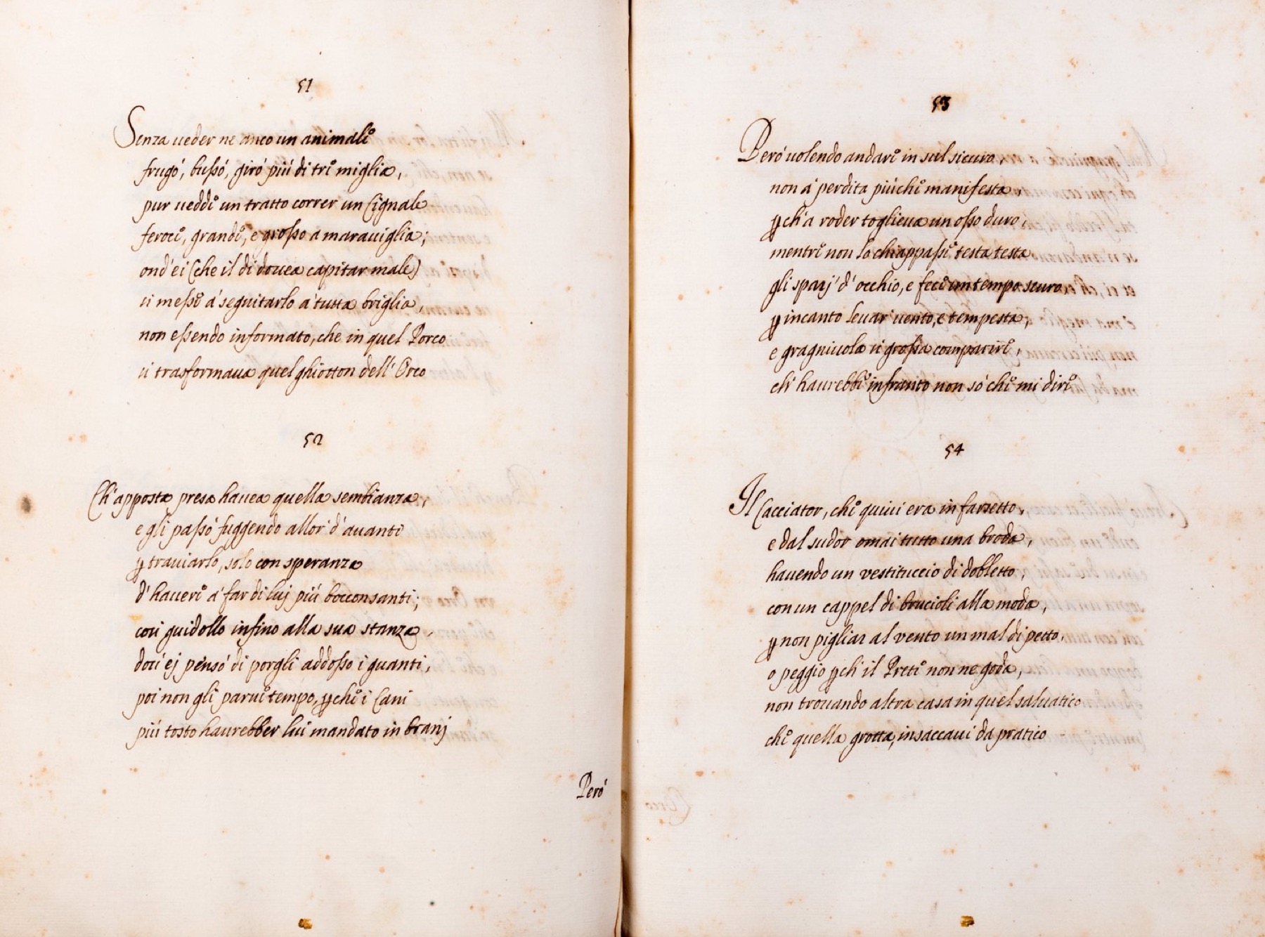 Manoscritto cartaceo della prima metà del Seicento, 340 x 210 mm., carte [1], 265 n.n. (di cui 12 bianche) , scrittura umanistica cancelleresca, chiara ed elegante con due Ottave per pagina, richiamo a fine carta, frontespizio in lettere capitali racchiuso in cornice a triplice filetto, marginali fioriture su alcune carte, legatura coeva in piena pergamena con titolo al dorso.
