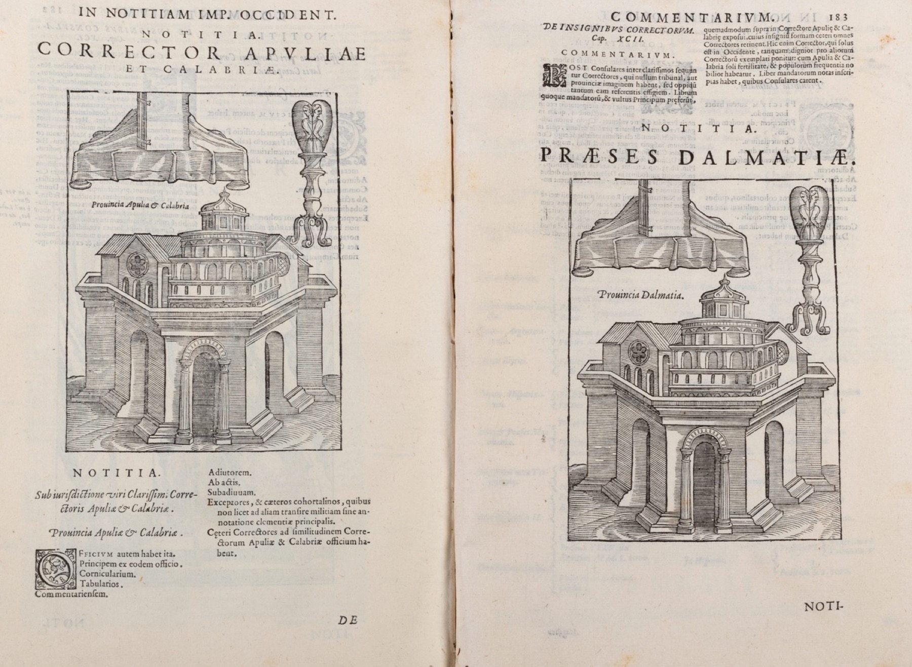 Accurata ristampa (1 ed. Basilea 1552) di questo celebre "Manuale" d'amministrazione civile e militare del tardo impero romano redatto verosimilmente nel quarto secolo dopo Cristo. La trattazione e divisa in due sezioni, corrispondenti alle due parti dell'impero, Oriente e Occidente, enumerando per ciascuna le insigna con i titoli ufficiali, i funzionari, i prefetti, ecc. Di ciascuna sono indicati la competenza territoriale, gli uffici o le truppe dipendenti e la composizione dell'Officium. E' dunque un quadro prezioso dell'ordinamento dell'Impero, che offre notizie sulla dislocazione delle truppe, le aziende di stato e fa conoscere numerosi nomi di luoghi. Affascinante l'apparato iconografico. Brunet IV, 111; Ebert 14905; Berlin Katalog 1768.