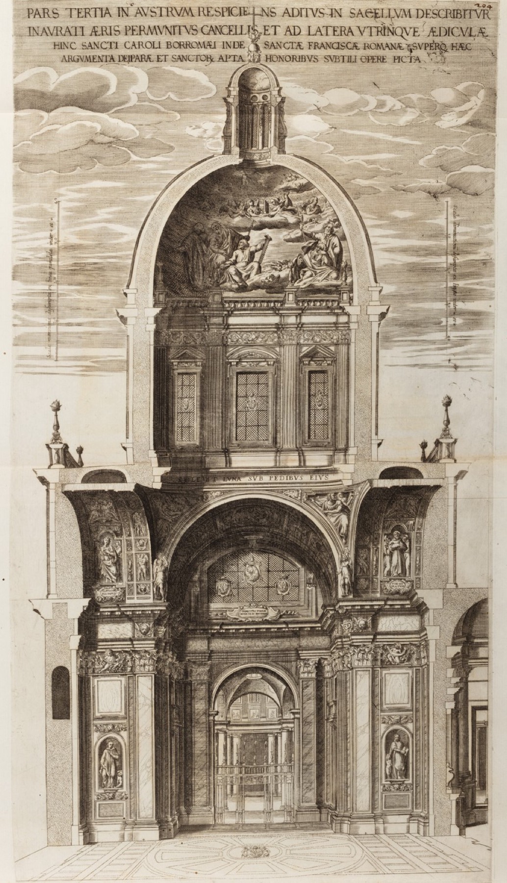 Roma, Bartolomeo Zanetti, 1621. In 2°. Con 16 (di 17) carte di tavole ripiegate incise in rame fuori testo e numerose incisioni in rame a piena pagina nel testo, frontespizio calcografico entro struttura architettonica con quadri e didascalie riguardanti la storia della Basilica, iniziali e fregi xilografici, lievi fioriture, qualche carta leggermente brunita, piccolo lavoro di tarlo ai margini, tav. di pag. 65 parzialmente staccata, mancante la carta a1 in fine al volume, rinforzo a una tavola, legatura in pergamena, dorso e cerniere mancanti, aloni, difetti. Timbro di appartenenza alla carta di guardia, firma di appartenenza al frontespizio.