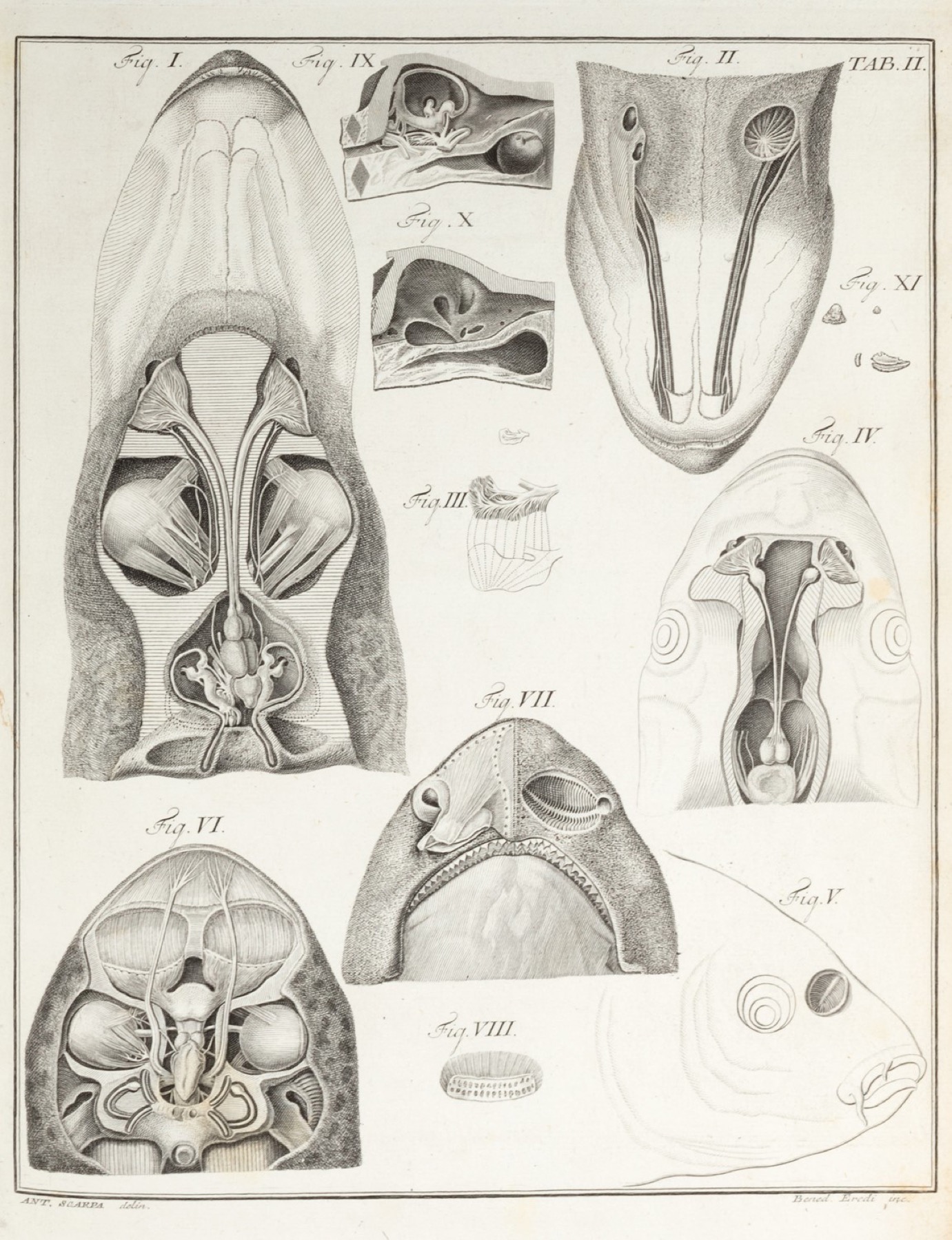 Rara seconda edizione con le stesse tavole dell'edizione originale del 1789, nell'opera Scarpa descrive i meccanismi uditivi e olfattivi di pesci, uccelli, rettili ed anche dell' uomo. Le otto lastre di rame furono disegnate dall'autore. Le prime cinque tavole trattano argomenti zootomici, le ultime tre dell'anatomia umana. Le prime due sono incise da Bededotto Eredi di Firenze, la terza non riporta il nome dell'incisore, ma sembra sia stata eseguita da Faustino Anderloni, il cui nome compare sotto le ultime cinque tavole. Scarpa, brillante artista oltre che geniale anatomista, studiò anatomia a Padova con Morgagni e chirurgia a Bologna. La sua eredità include lavori sull' otorinolaringoiatria, ortopedia, oftalmologia, neuroanatomia e chirurgia.