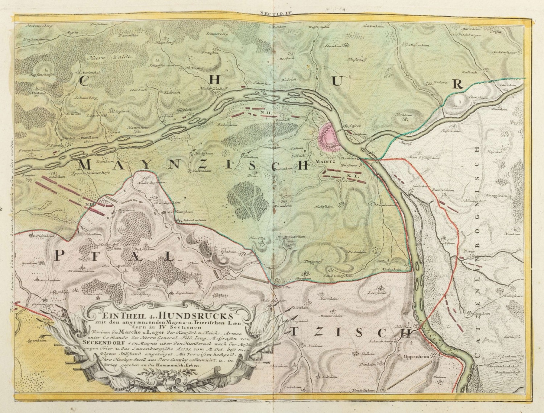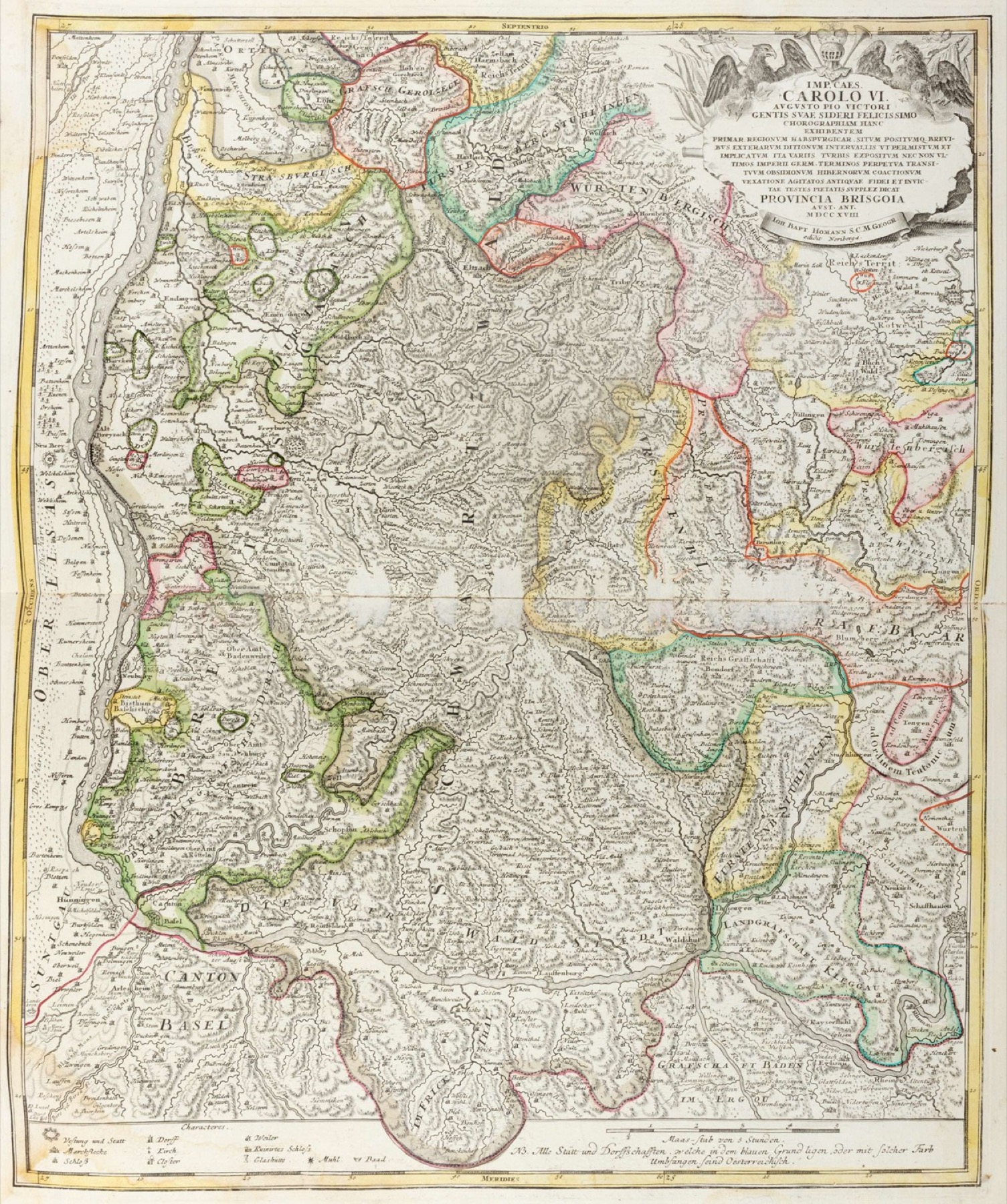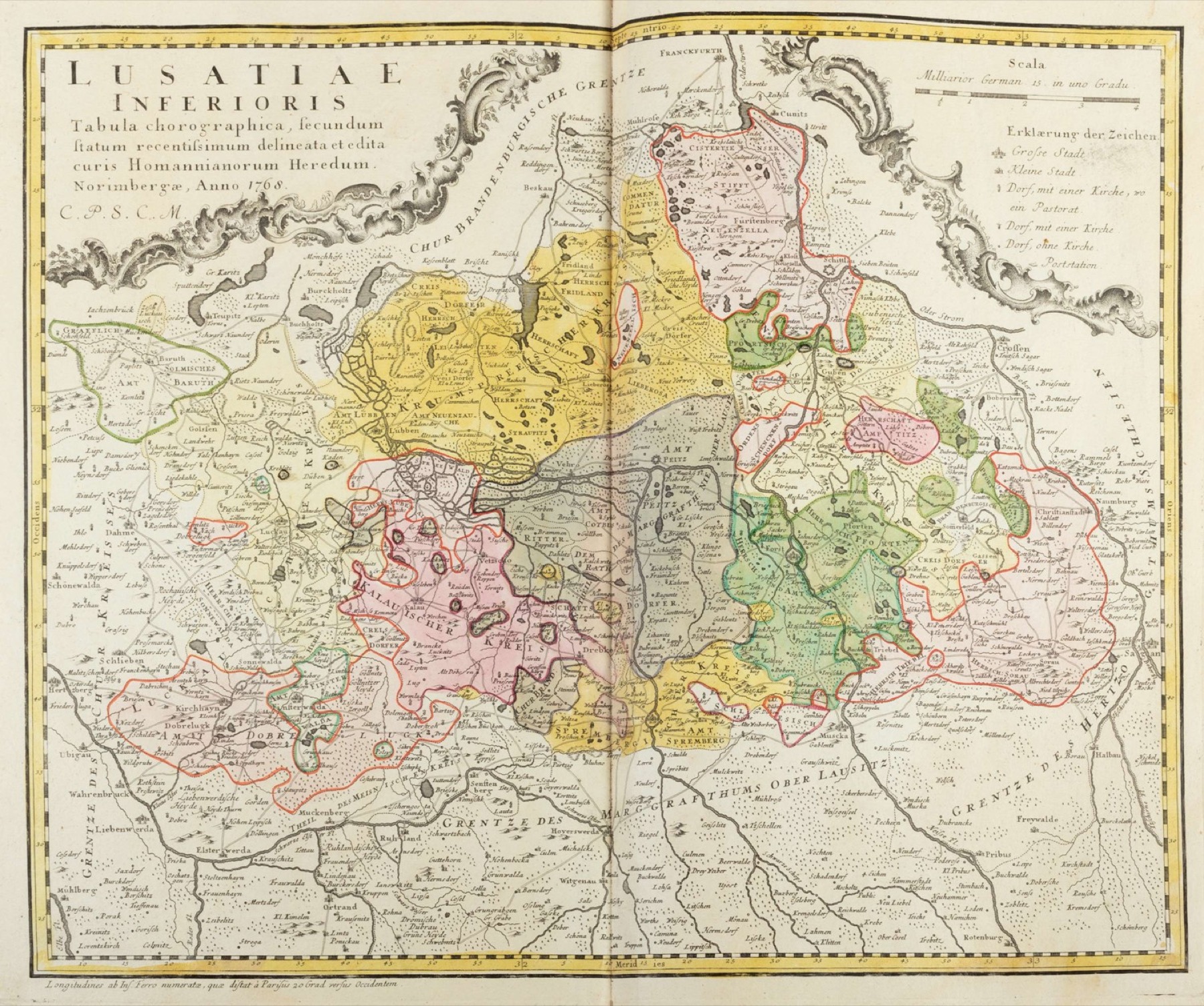 Atlante corredato di 90 carte geografiche che raffigurano gli antichi stati germanici e confinanti tra i quali: Germania, Alsazia, Baden, Assia, Colonia, Mainz, Trier, Palatinato, Westphalen, Sassonia, Franconia Svevis, Salisburgo, Tirolo, Stiria, Alta a e bassa Austria, Boemia, Slesia ed altri. Le carte furono realizzate da Muller e Schenk. Seguendo il lungo dominio olandese, la famiglia Homann divenne la più importante nella pubblicazione di mappe in Germania nel XVIII secolo. L’attività fu fondata nel 1702 a Norimberga da J.B. Homann che dopo la pubblicazione del primo atlante nel 1707 divenne membro dell’Accademia delle Scienze di Berlino e nel 1715 fu nominato Geografo dell’Imperatore. Dopo la sua morte, l’attività venne diretta dal figlio fino al 1730 e successivamente trasmessa ai suoi eredi con il nome, appunto, di Eredi Homann.