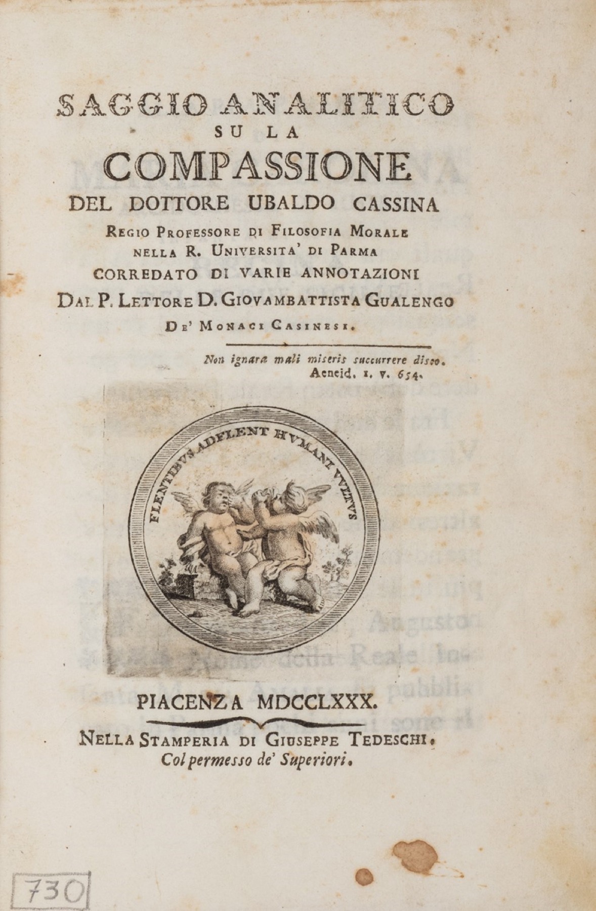 Seconda edizione dopo quella stampata dal Bodoni. Lettera dedicatoria alla Maestà Maria Carolina arciduchessa d'Austria, infanta di Spagna Regina delle Due Sicilie. Nella parte prima si analizza la compassione dei mali reali e quelli d'imitazione; nella seconda gli influssi della compassione sulla società.
