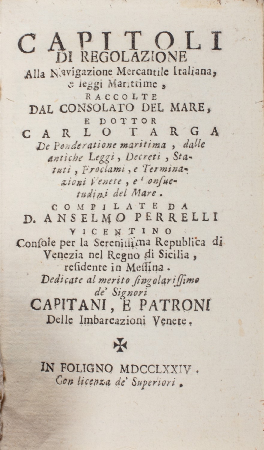 Diritto Marittimo / Targa, Carlo - Capitoli di regolazione alla Navigazione Mercantile Italiana e Leggi Marittime, raccolte dal Consolato del Mare