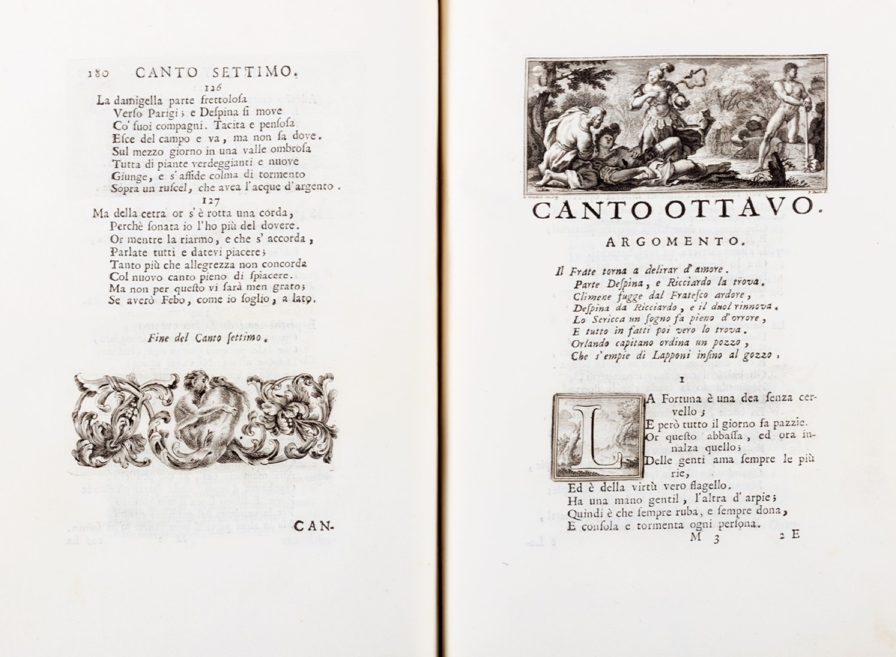 Parigi [ma Venezia], a spese di Francesco Pitteri, 1738. 2 parti in 2 vol. In 4°. Ritratto calcografico dell'autore in antiporta, frontespizio stampato in rosso e nero con vignetta incisa in rame, testatine, finalini e capilettera incisi in rame da Zucchi, Pitteri e altri su disegno di Ghedini, occhietto al vol.II, qualche difetto per assottigliamento della carta su A1 vol.I, qualche leggero alone di umidità al margine del vol.II, legatura coeva in mezza pelle, dorso a 5 nervi impresso in oro, con tassello, alcuni piccoli fori di tarlo ai dorsi.