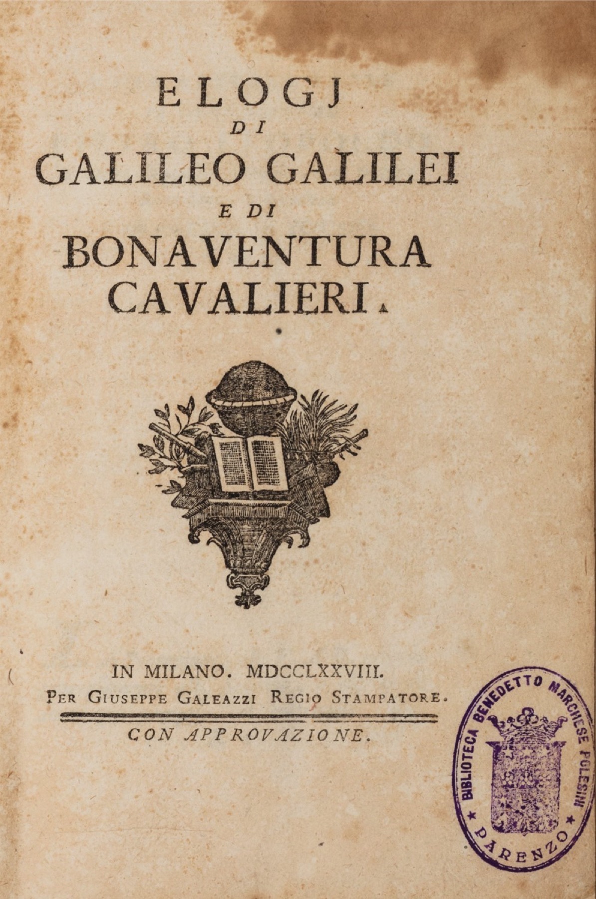 Milano, Giuseppe Galeazzi, 1778. In 8°. Fregio inciso in legno al frontespizio con strumenti scientifici, fogli in barbe, con la carta D4 bianca, bruniture, alone di umidità al margine superiore, legatura coeva in cartonato, tassello cartaceo al dorso. Ex libris cartaceo al contropiatto e timbro di appartenenza al frontespizio: Benedetto Polesini, Parenzo.