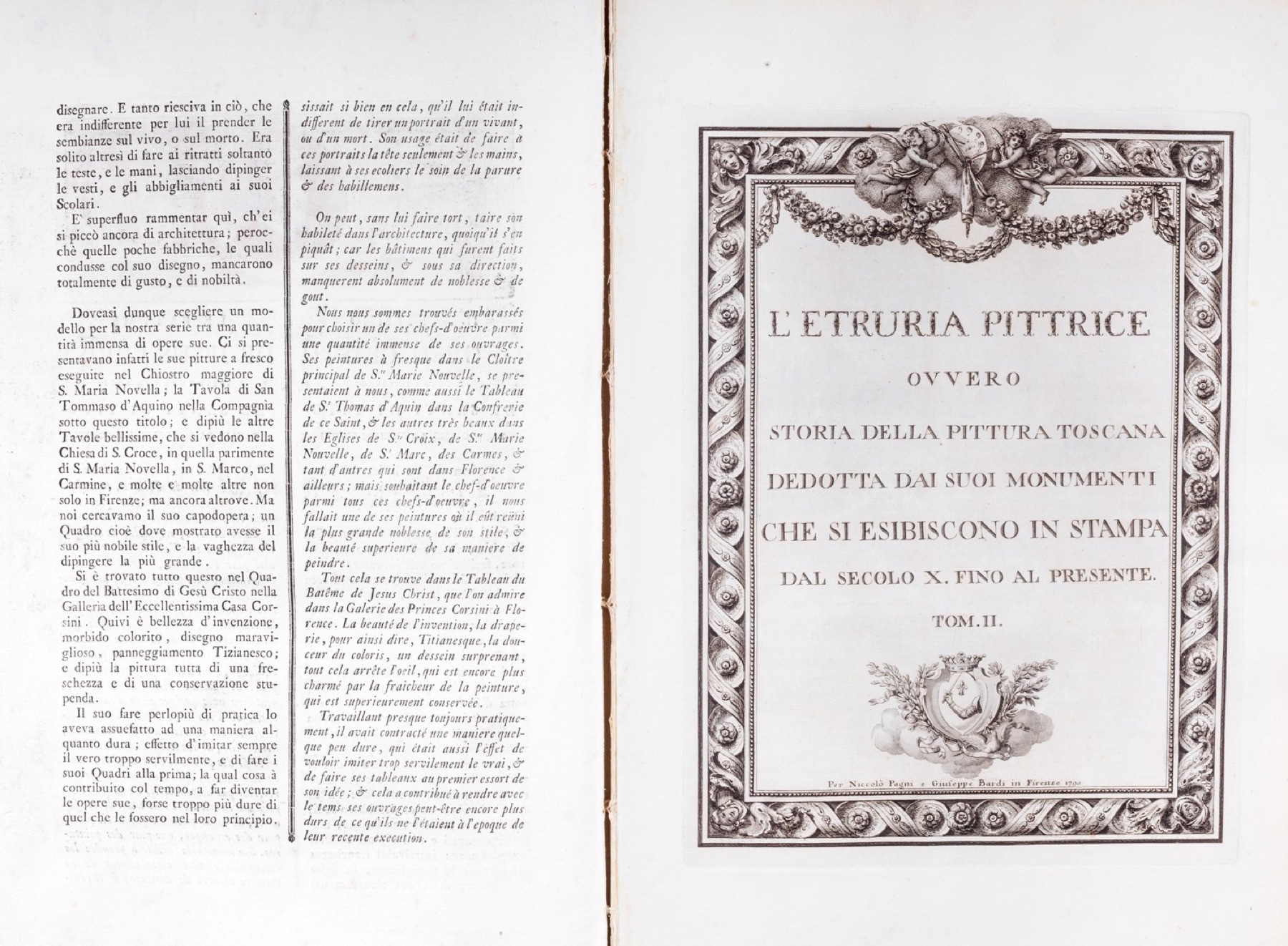 Firenze, Niccolò Pagni e Giuseppe Bardi, 1791-'95. In 2°. 2 parti in un volume, ciascuno con proprio frontespizio calcografico entro cornice decorata, testo su due colonne in italiano e francese, testate con i ritratti dei pittori e fregi tipografici incisi in rame, diverse carte di colore azzurro, tavole mancanti, qualche alone d'umidità e leggere macchie, legatura coeva in mezza pergamena, titolo manoscritto al dorso, bruniture al cartonato dei piatti.